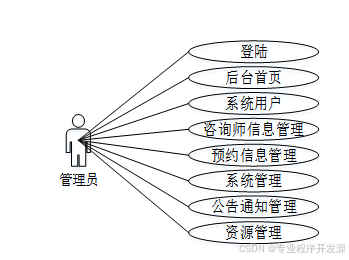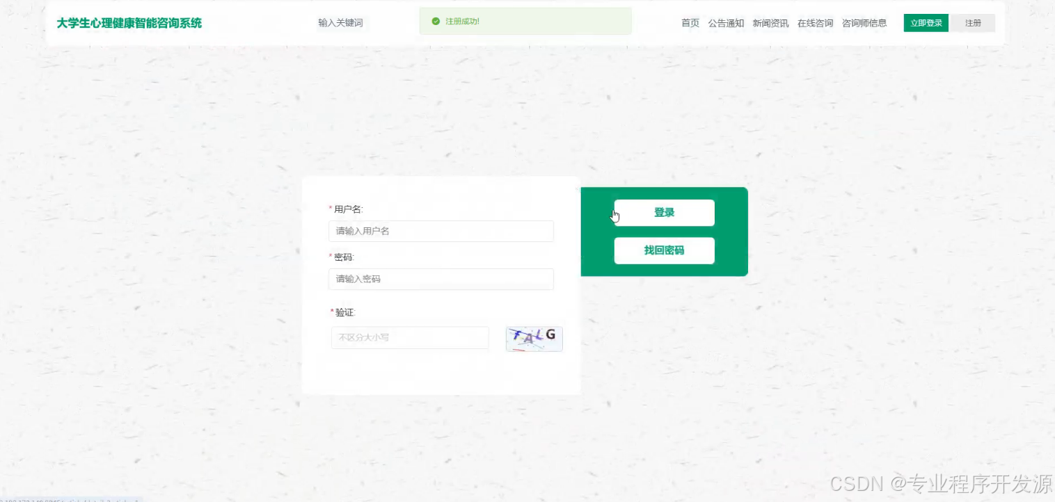 - 登录:咨询师用户由管理员添加,并且咨询师可以通过前台登录系统,以便进行在线咨询的回复。系统提供安全的认证机制,确保只有授权的咨询师可以访问其账户。