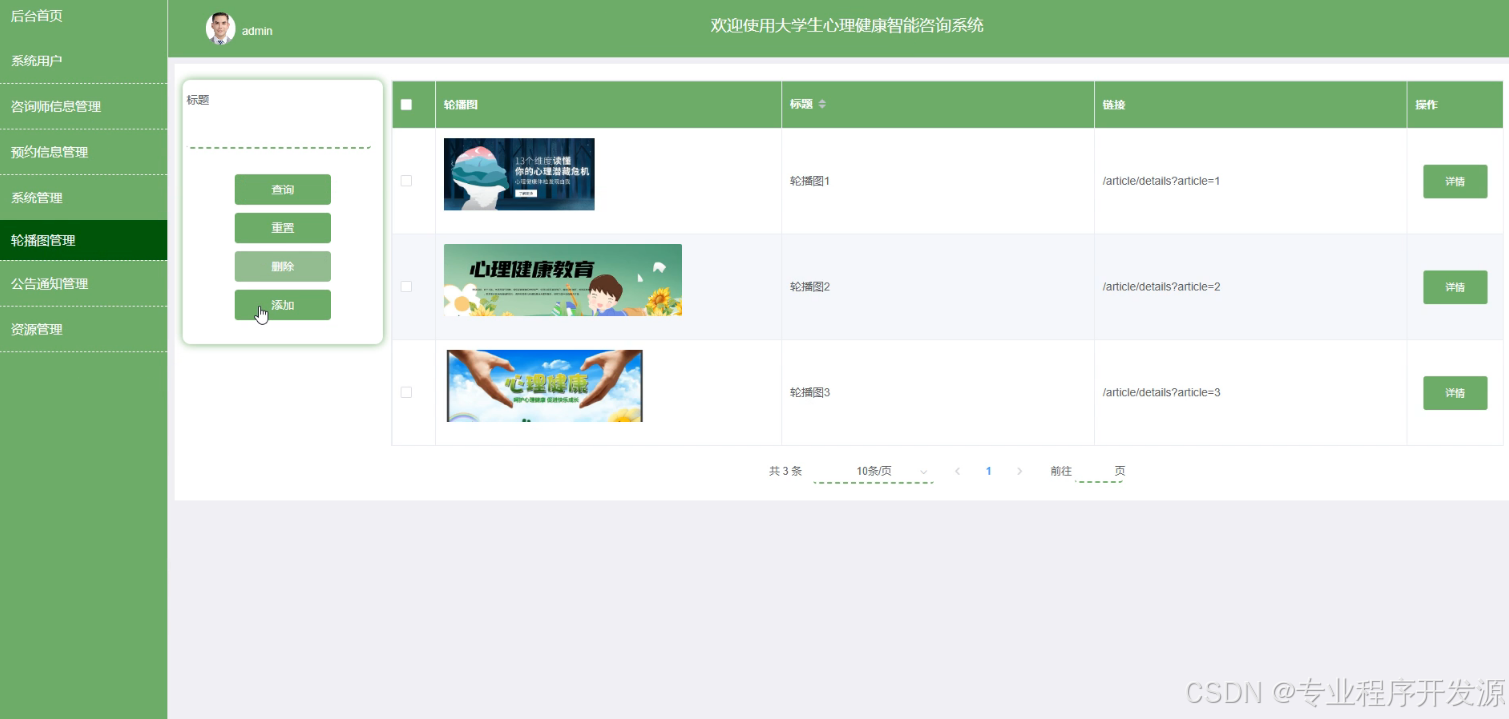 - 预约信息管理:管理员可查看所有学生的预约申请,按时间、咨询师或状态筛选查询。支持删除无效预约,点击详情可查看预约时段、学生需求及备注,并对新提交的预约进行审核操作,通过后自动通知学生与咨询师。