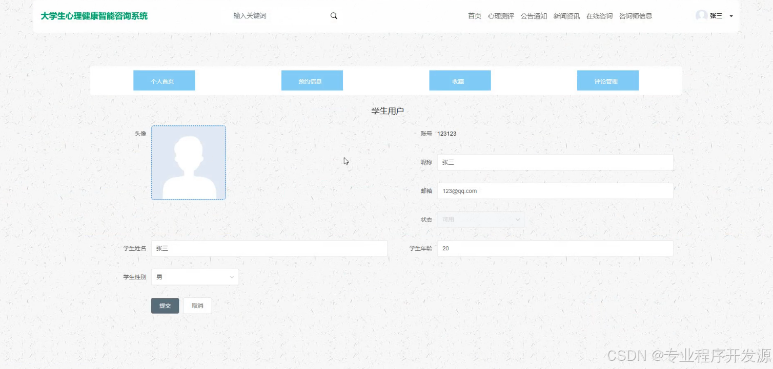- 个人中心:整合用户个人主页、预约记录、收藏内容及评论管理功能。可查看当前咨询预约状态、取消或修改预约,并对收藏的文章、咨询师或历史评论进行编辑或删除。