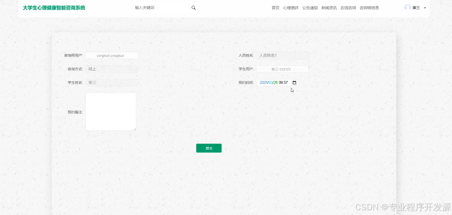 This system is designed and developed based on the SpringBoot framework, and builds an intelligent consultation service platform according to the mental health needs of college students. The system adopts B / S architecture, combines JAVA language and MyBatis-Plus data persistence layer technology to realize multi-role collaborative management mode, including three functional modules: student user, consultant user and administrator. Student side provide psychological assessment, AI intelligent quiz, online consulting, consultant appointment, news and information interaction, such as core functions, support thumb up collection, comment interaction, consultant side integrated review, assessment appointment bank management, online consulting reply and other professional services, management through the authority control, complete the user management, resource maintenance, announcement, system level operation, build a complete mental health service ecosystem.
