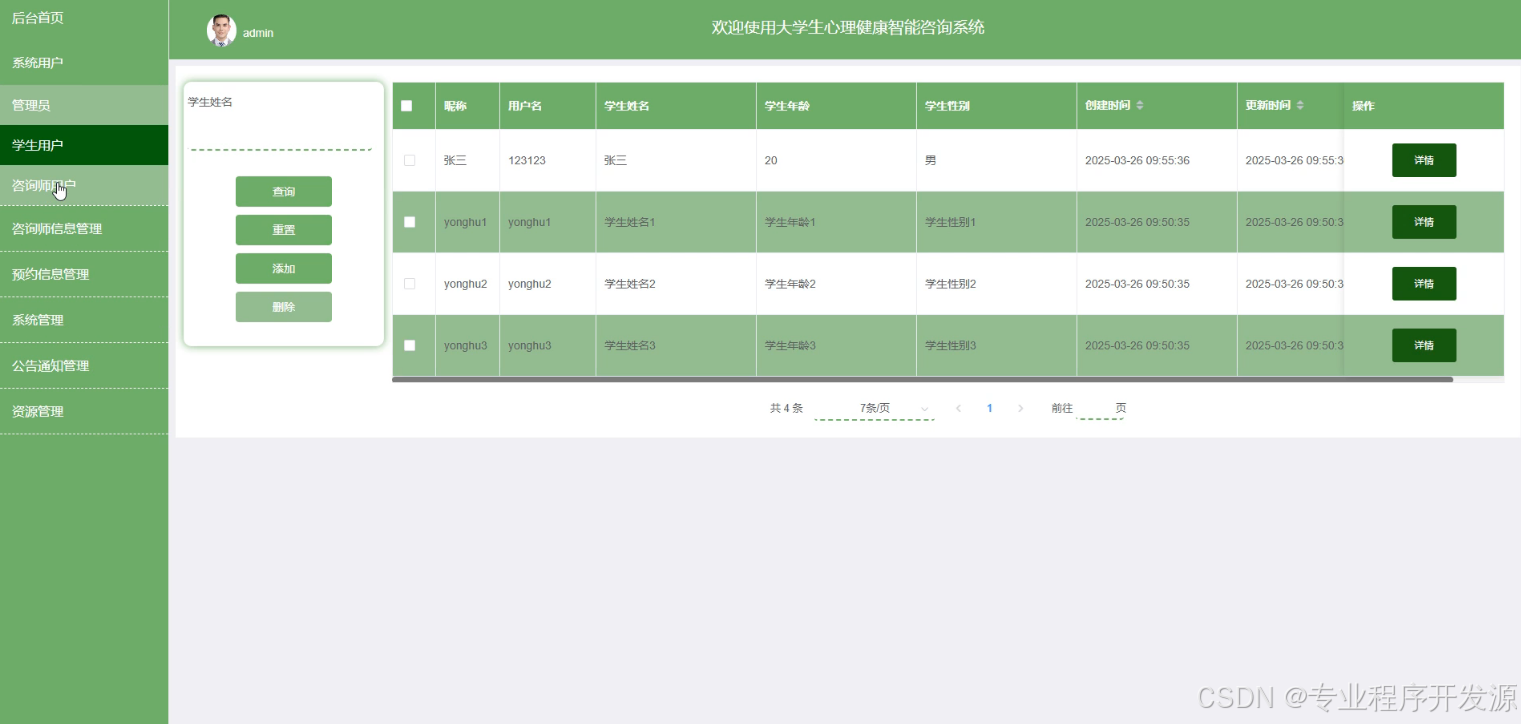 - 系统用户:系统用户模块分类管理三类角色:管理员拥有最高权限,可分配其他角色;学生用户信息包含学号、联系方式等基础数据;咨询师用户则关联资质认证及服务领域。支持按角色筛选、导出用户列表,并设置账号状态(启用/禁用)。