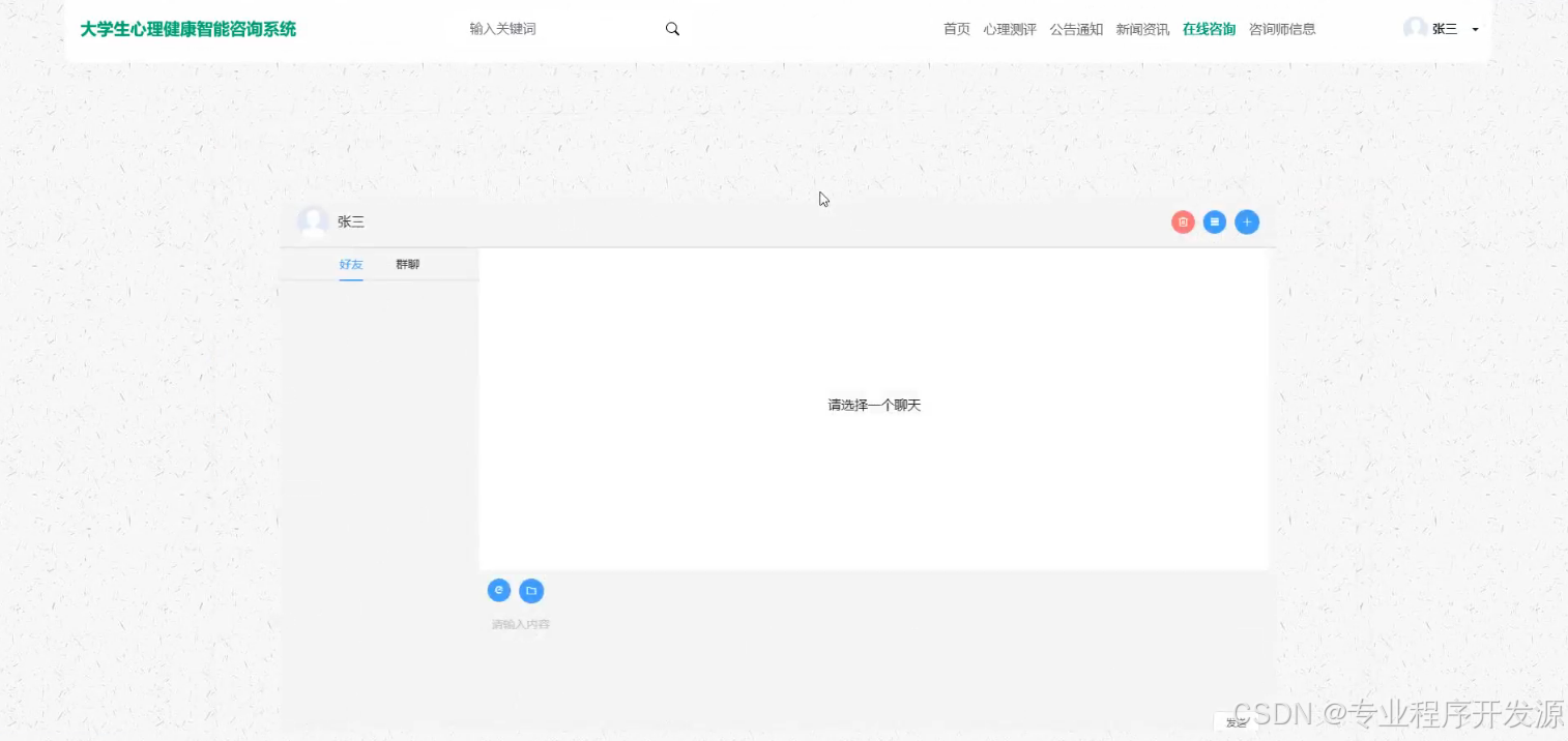 - 在线咨询:学生可搜索并添加认证咨询师进行一对一私聊,或根据需求创建群组讨论特定话题。聊天界面支持文字、语音及文件传输,咨询记录可加密保存。