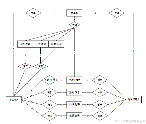 系统采用B/S架构,结合JAVA语言和MyBatis-Plus数据持久层技术实现多角色协同管理模式,包含学生用户、咨询师用户和管理员三大功能模块。学生端提供心理测评、AI智能问答、在线咨询、咨询师预约、新闻资讯交互等核心功能,支持点赞收藏、评论互动等社交行为,咨询师端集成预约审核、测评题库管理、在线咨询回复等专业服务功能,管理端通过实现权限控制,完成用户管理、资源维护、公告发布等系统级操作,构建了
