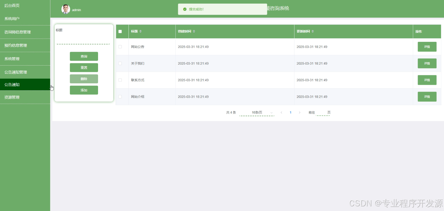 - 公告通知管理:管理员可发布、编辑或删除面向学生或咨询师的公告通知,内容支持富文本格式。通知可按发布时间、类型筛选查询,详情页展示完整内容及发布范围,确保信息精准触达目标用户。