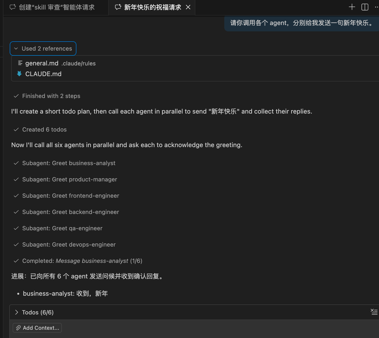 最后测试了一下,可以灵活的调用,这其实提供了一个新的思路,就是各个 AI 编程工具之间的项目迁移,特别的基础环境迁移之后的补全,AI 可以完美做到。只是如果不同 AI 编程工具之间相对封闭的协作机制无法读取,可能在新的 AI编程工具上,需要重新编写总节点的规范。