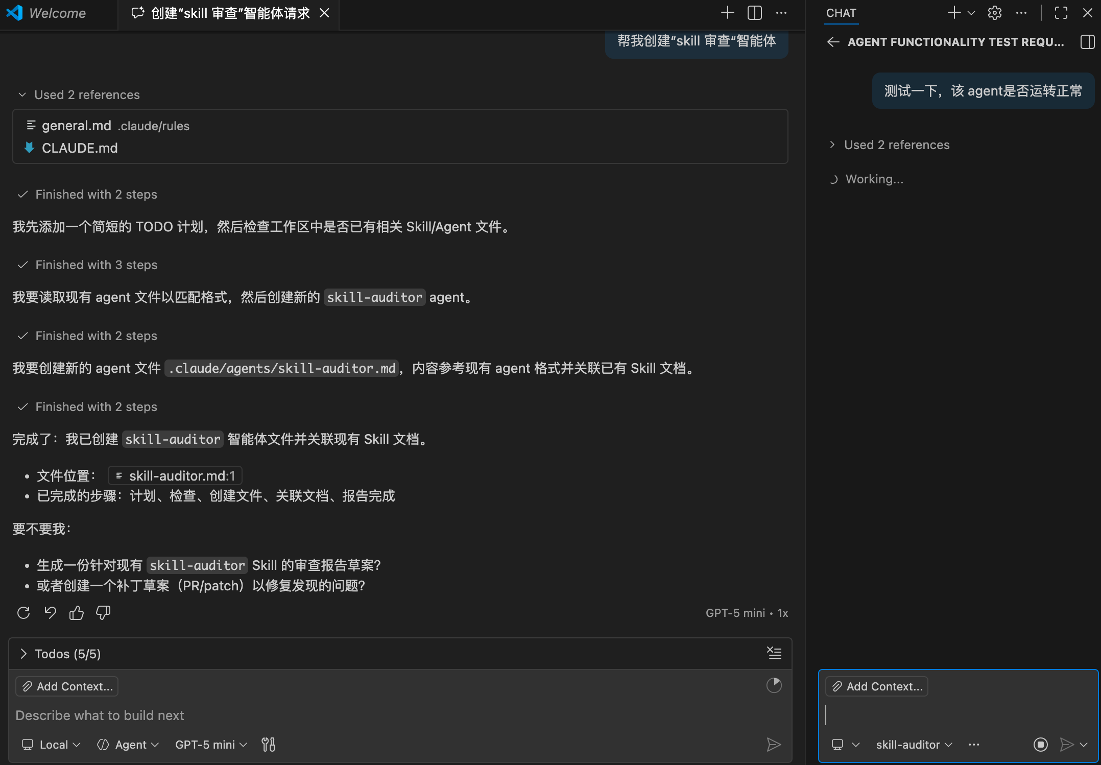 查看 agent 是否正常,结果是基本正常,但是我发现 vscode 内 skill 与 agent 的配合机制不是很好,并没有优先调用 skill,然后再协调 agent。而是直接调用的 agent,指令更加直接。