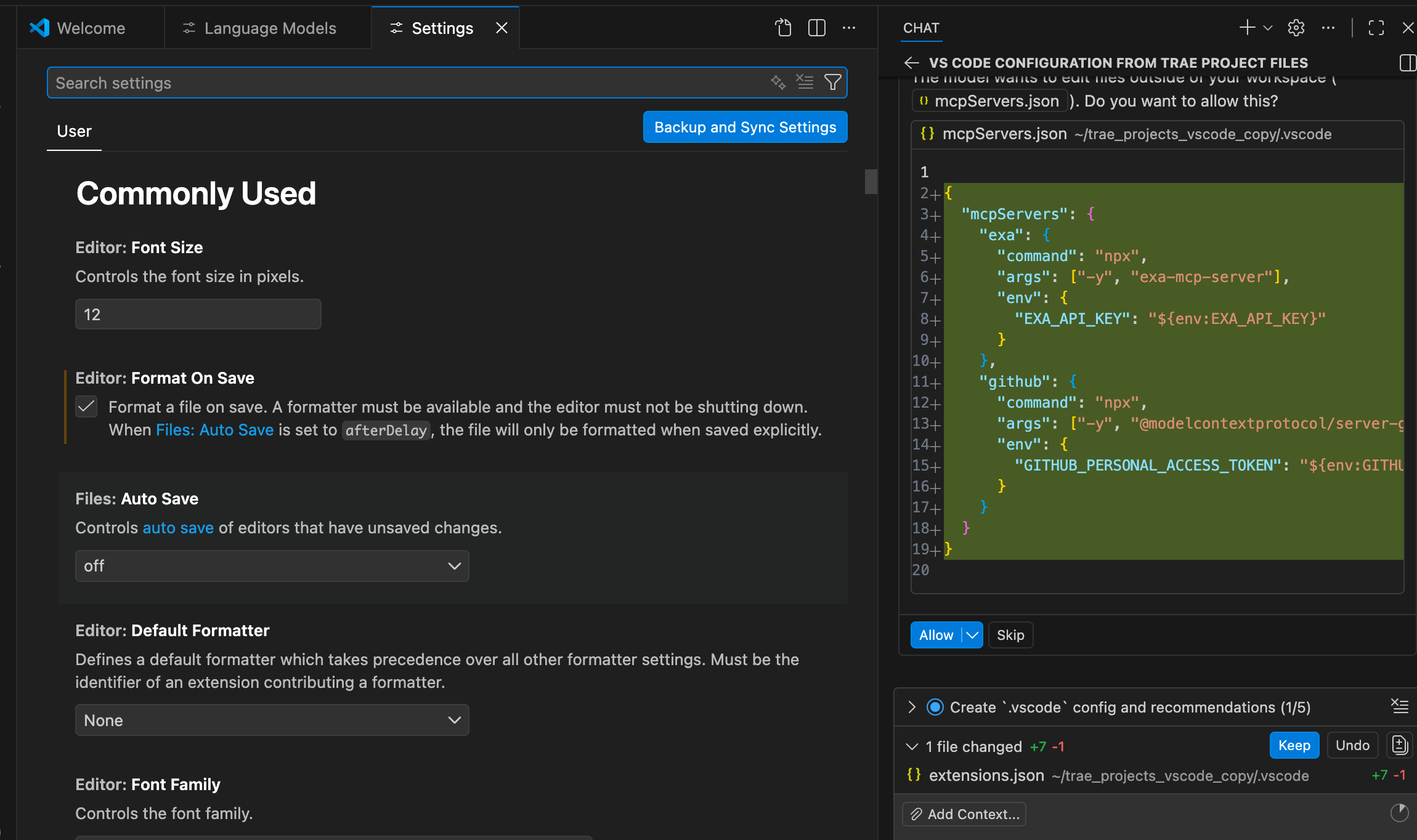 比如,你可以让 AI 读取 Trae 的配置文件,然后自动生成对应的 VS Code 配置。这种"配置翻译"的能力,大大降低了工具切换的成本。你不需要手动复制粘贴,只需要把配置文件丢给 AI,它就能帮你生成目标格式的配置。