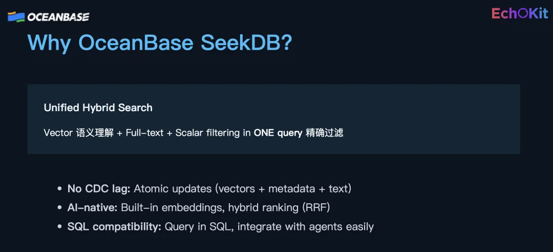 在知识库和数据检索这一层,EchoKit 选择了 OceanBase seekdb。