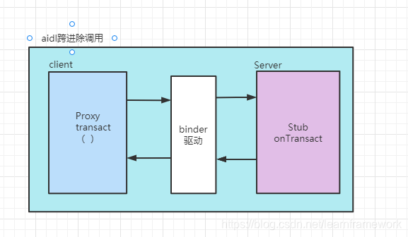 这是一张图片,ocr 内容为:AIDL跨进除调用 O CLIENT SERVER PROXY STUB TRANSACT BINDER () ONTRANSACT 驱动 HTTPS//BLDG.CS'DN.NET/LELARNITARNEWC回忆。