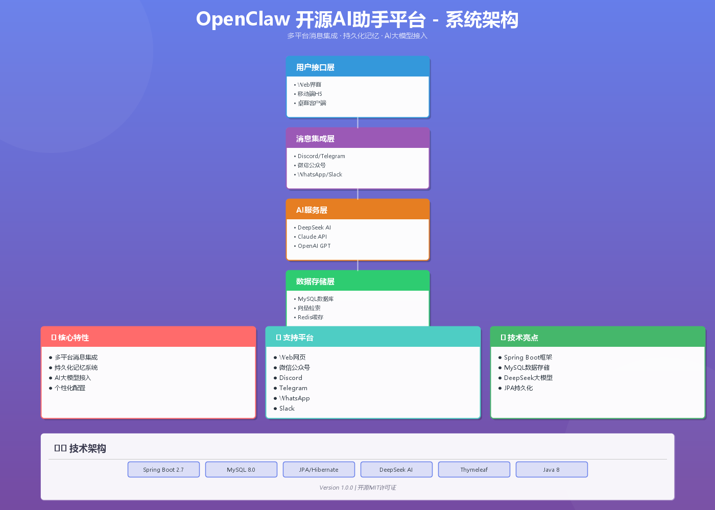 上图展示了OpenClaw完整的五层架构设计,从消息接入到数据存储,每一层都精心设计,确保系统的高可用性和可扩展性。