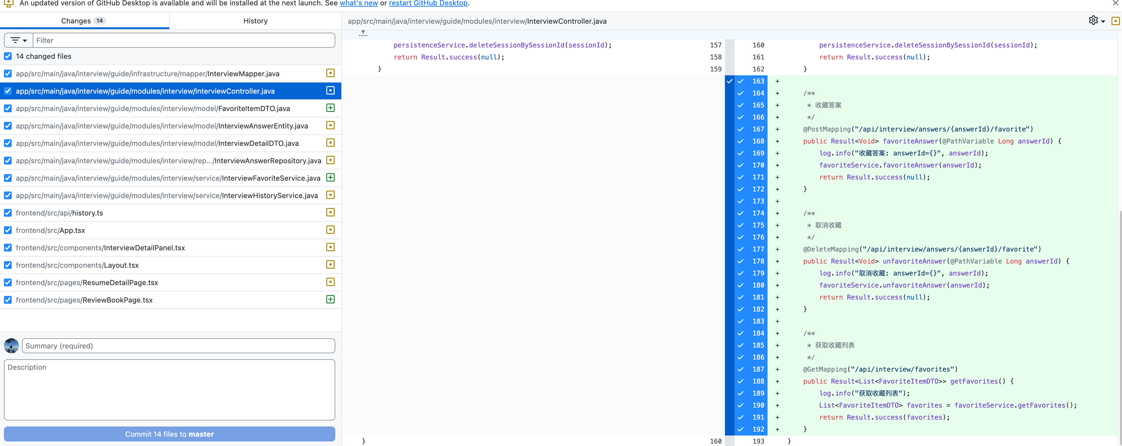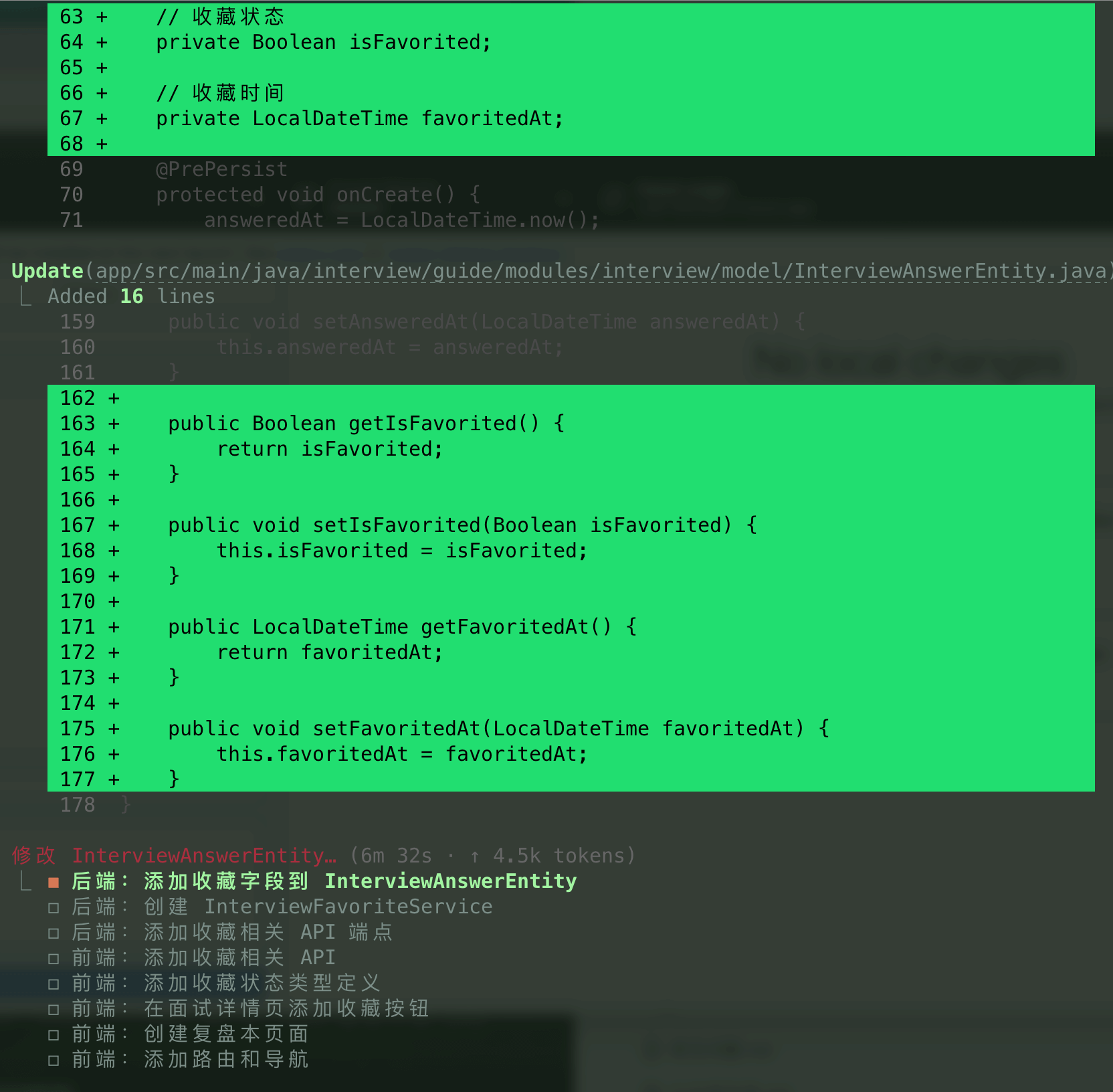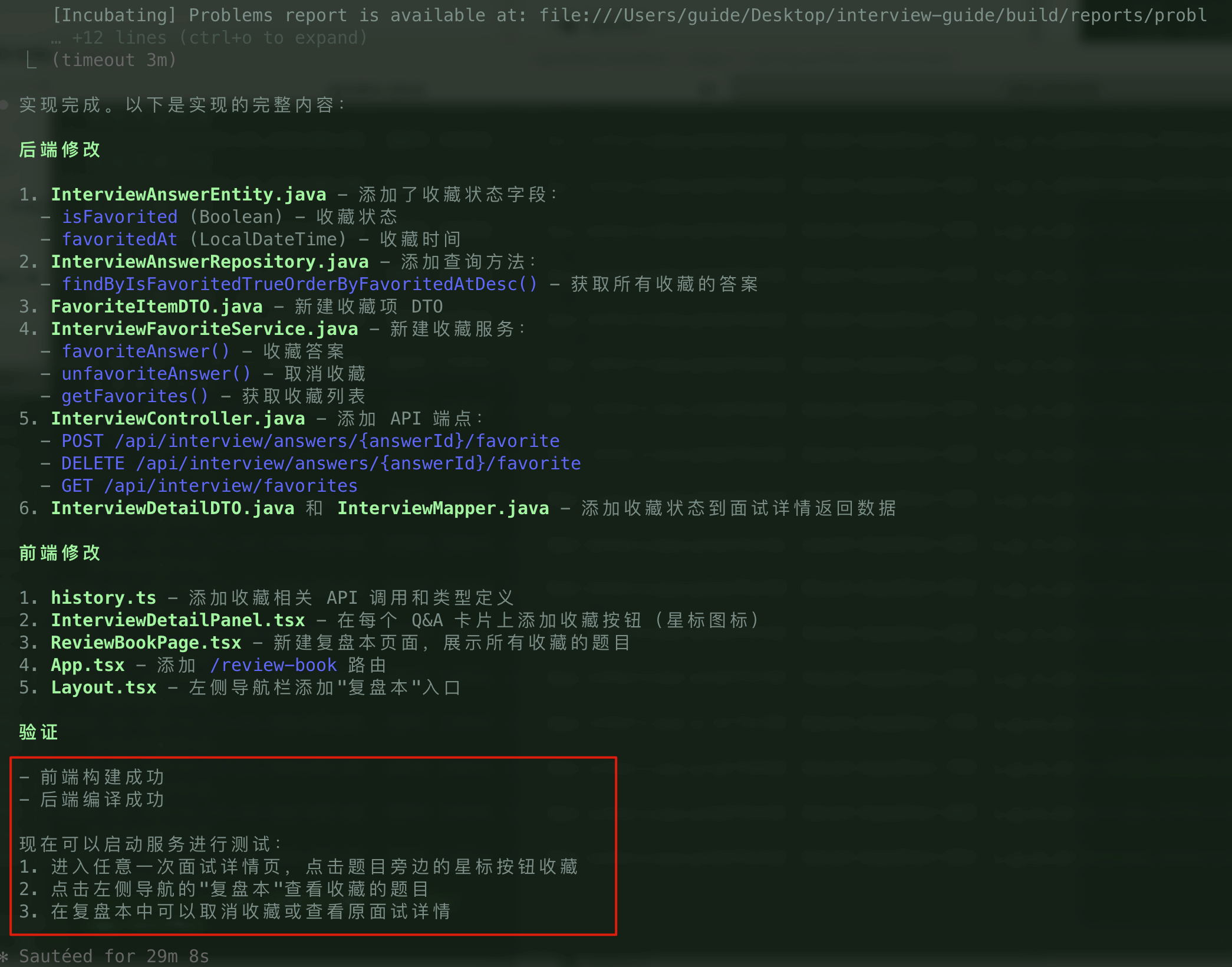 InterviewFavoriteService正确使用@Transactional事务注解,并遵循贫血模型设计(业务逻辑在 Service,Entity 只负责数据)。 - 前端:检测到项目使用 React + TypeScript ,自动复用现有组件并和现有项目样式保持一致。