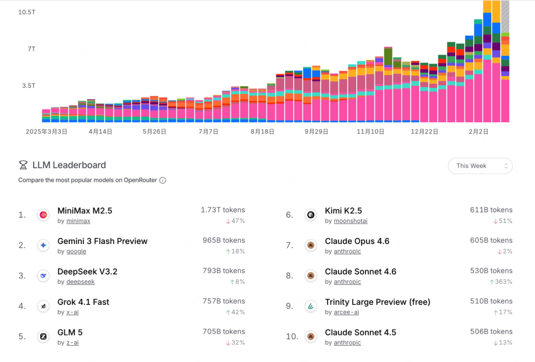 M2.5 目前已经是 OpenRouter 调用量的榜一了:
