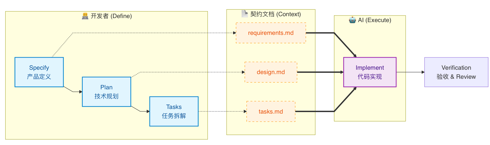 - Implement(AI 执行): 将前面的 Spec(