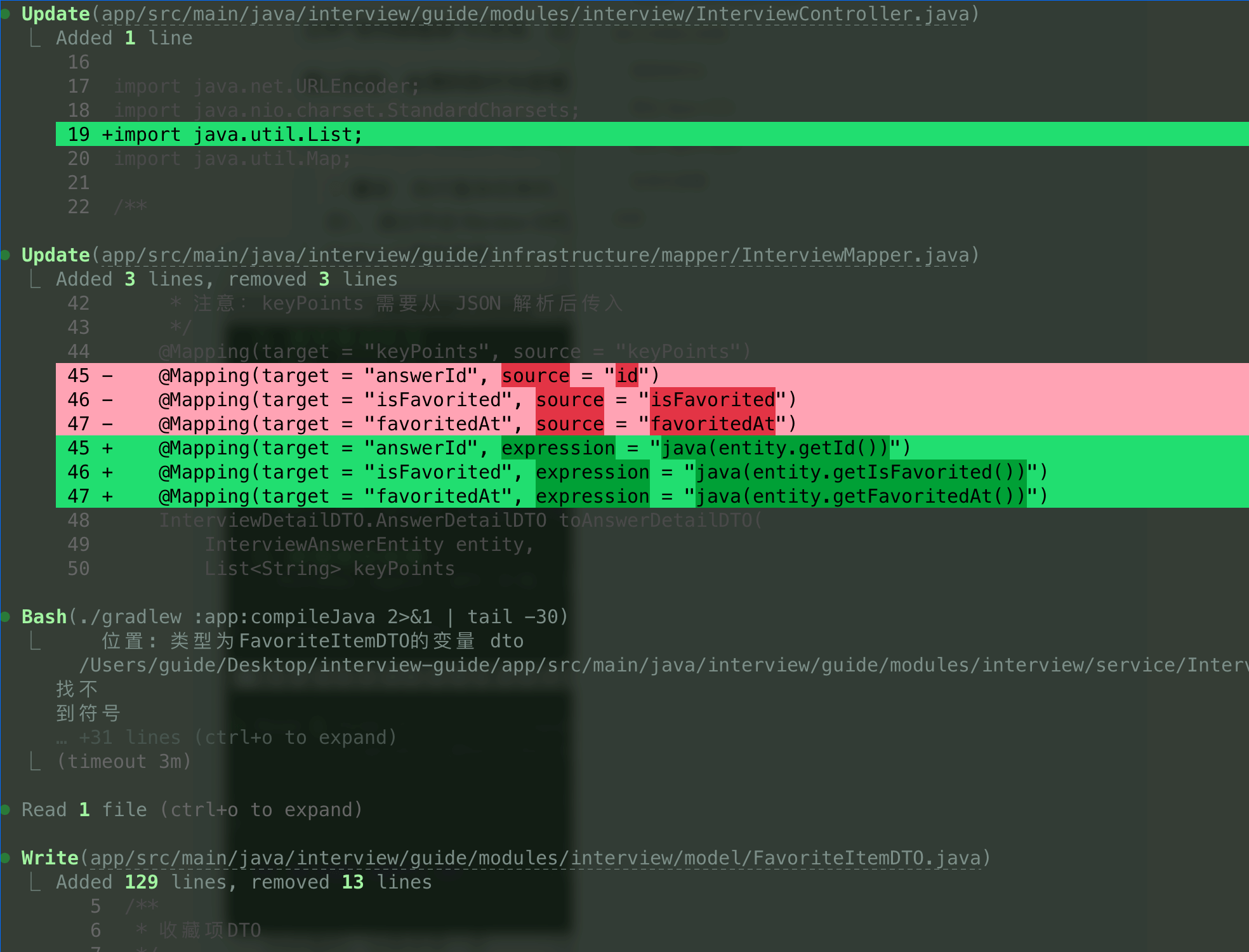 更让我意外的是它的错误自愈能力。由于修改了数据类型,遇到了 MapStruct 匹配不上的错误。它会自己分析修复,然后继续测试运行。