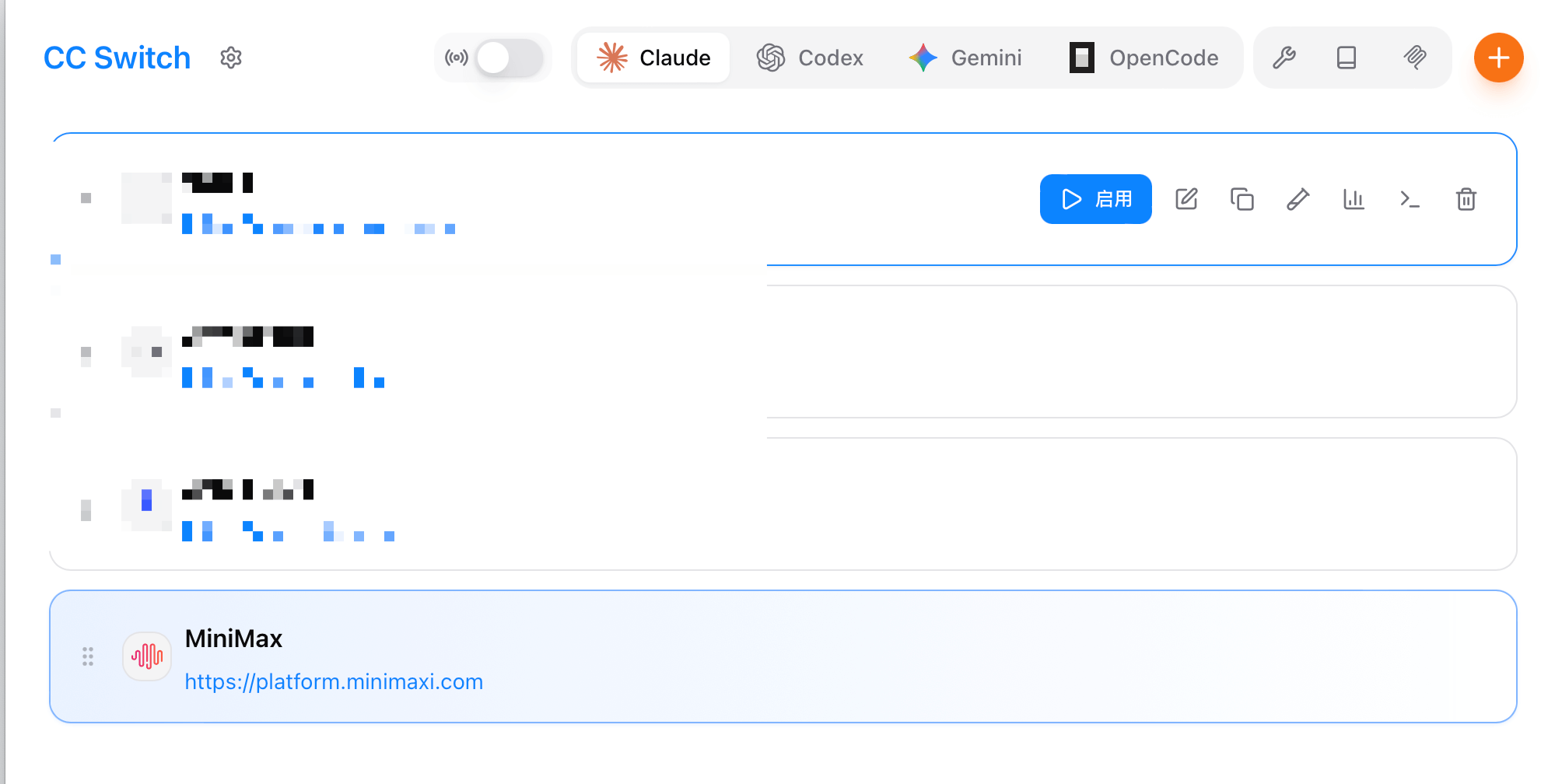 启动 CC Switch,点击右上角 ”+” ,选择预设的 MiniMax 供应商,并填写你的 MiniMax API Key。