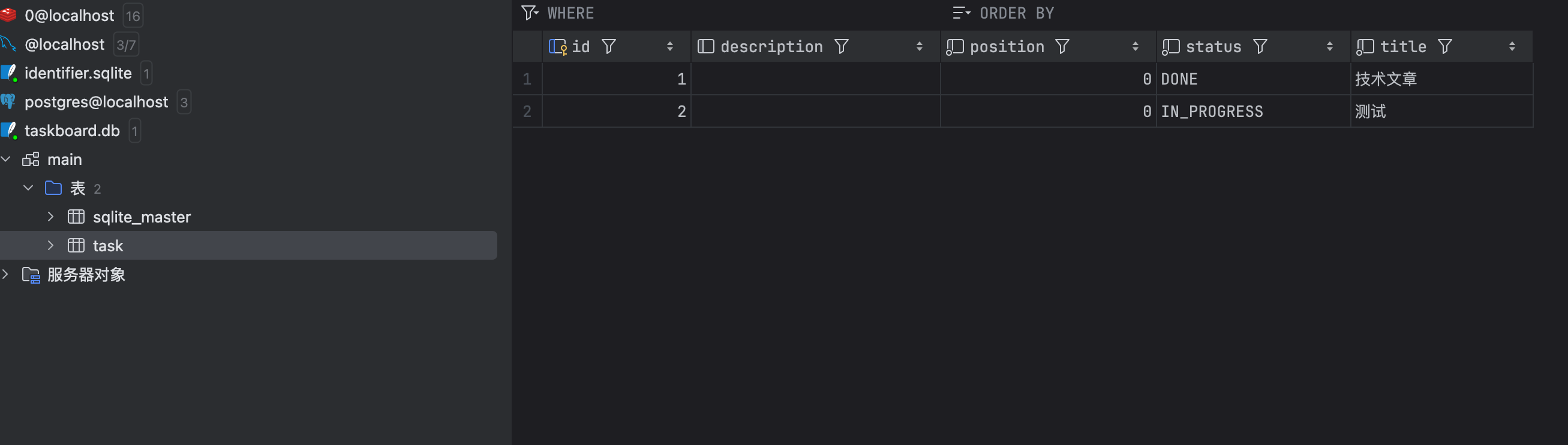 我用 DataGrip 连接 SQLite 文件验证数据持久化,可以看到,任务数据也是成功保存在了数据库中。