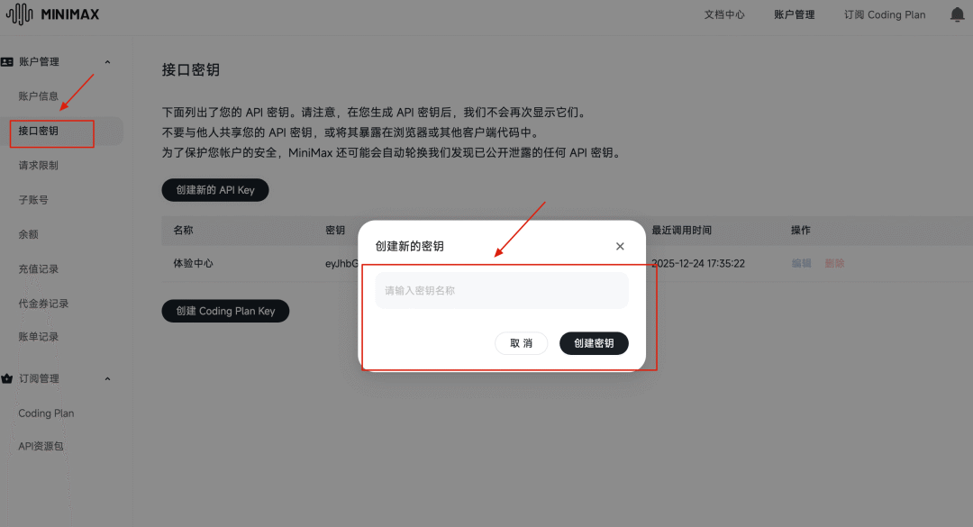 先去 MiniMax 开放平台获取 Key:https://platform.minimaxi.com/user-center/basic-information/interface-key