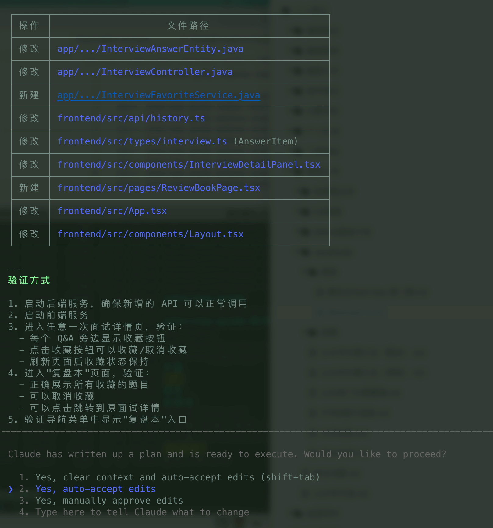 确认 Plan 后,我选择 Option 2:auto-accept edits(自动接受修改)。