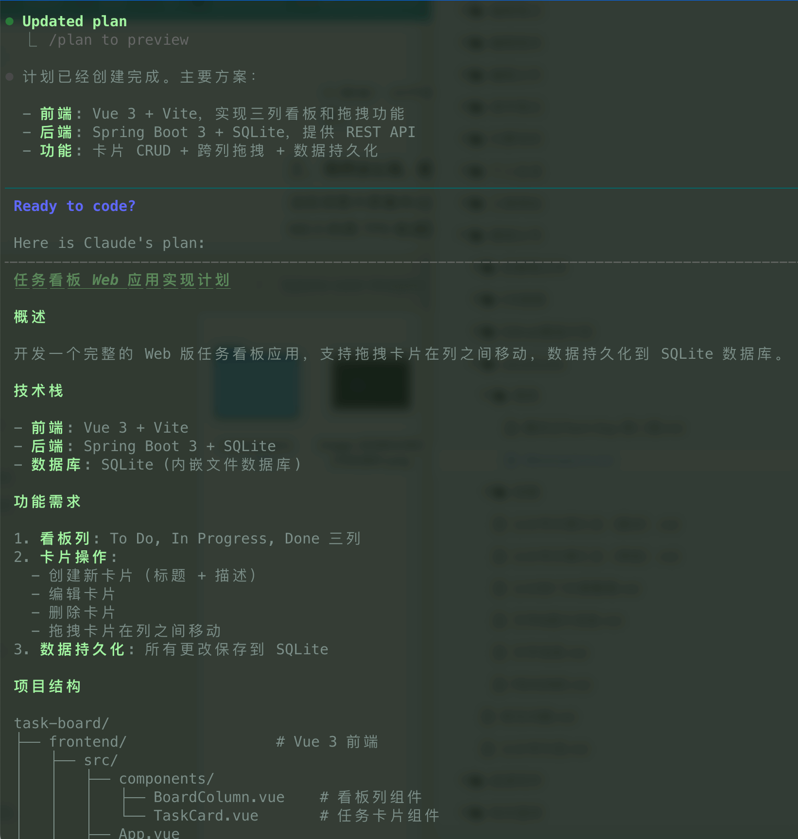 然后,它进入了"Plan Mode"。它输出了一份极其详细的实现计划,包含技术栈、功能需求、项目结构、API 和数据库设计、实现步骤等内容。