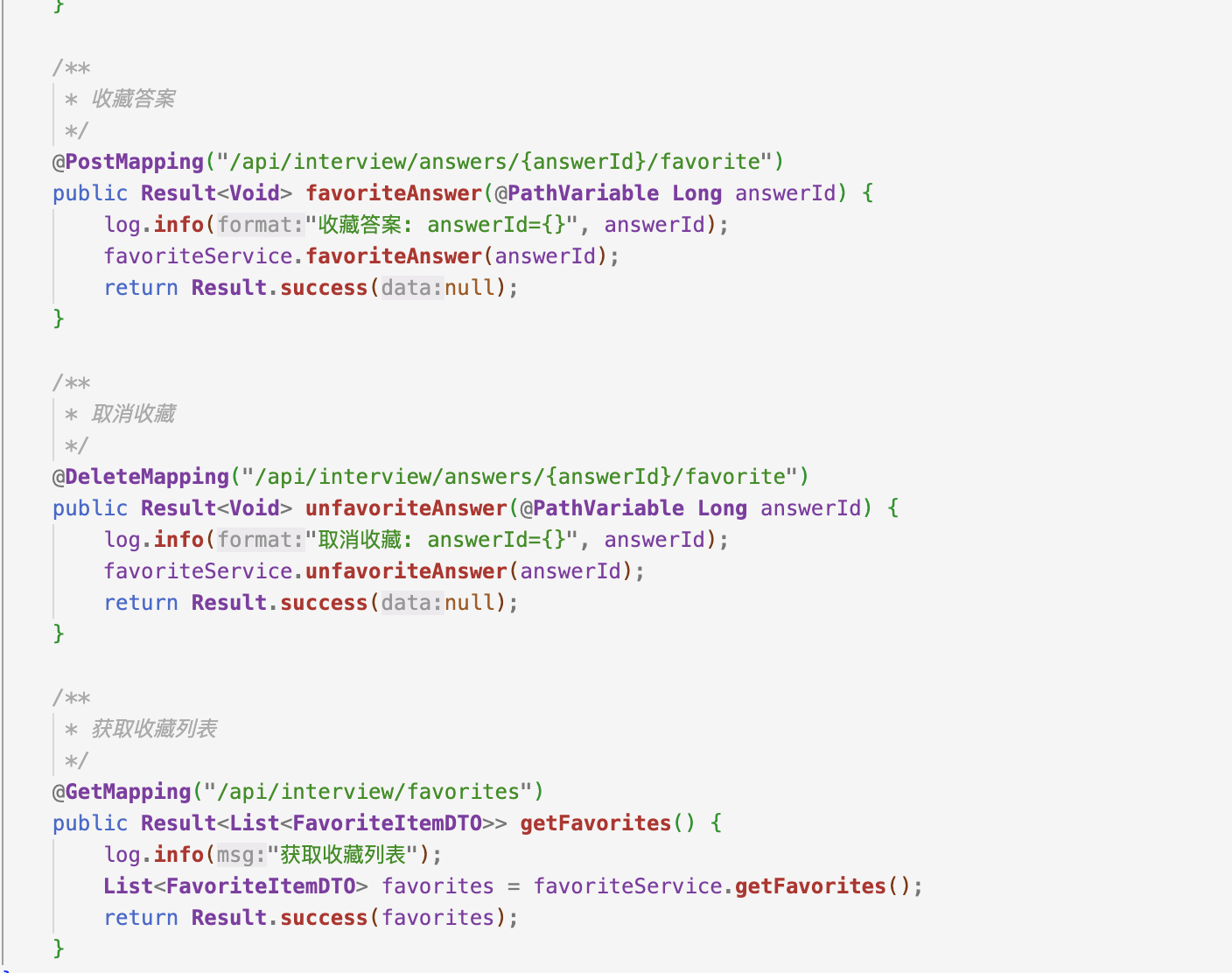 InterviewAnswerEntity中优雅地扩展字段。复用已有实体,避免过度设计,同时通过favoritedAt为后续的"按时间排序"预留了扩展空间。 - RESTful API 设计:RESTful 接口路径、请求/响应参数、状态码规范。