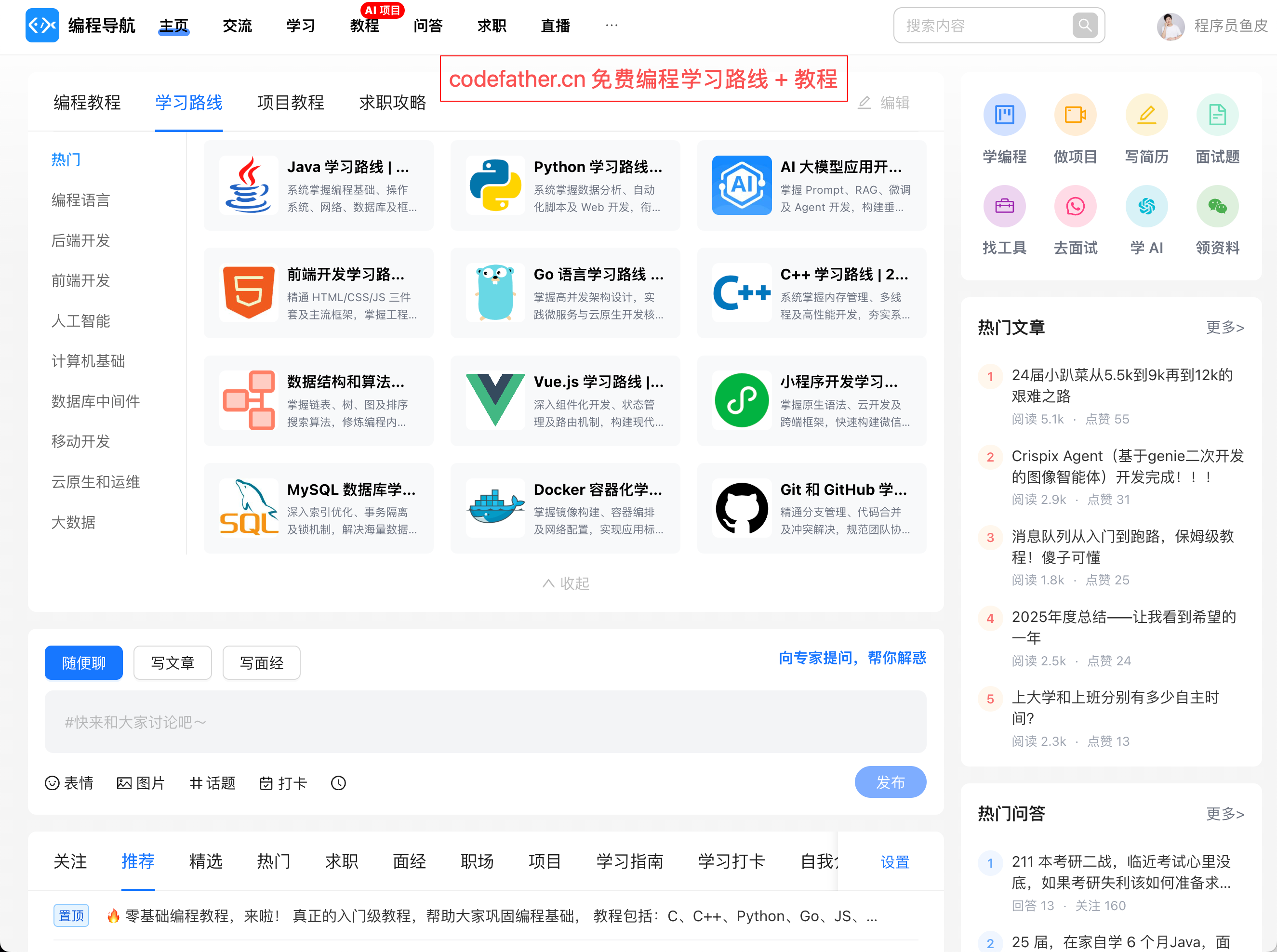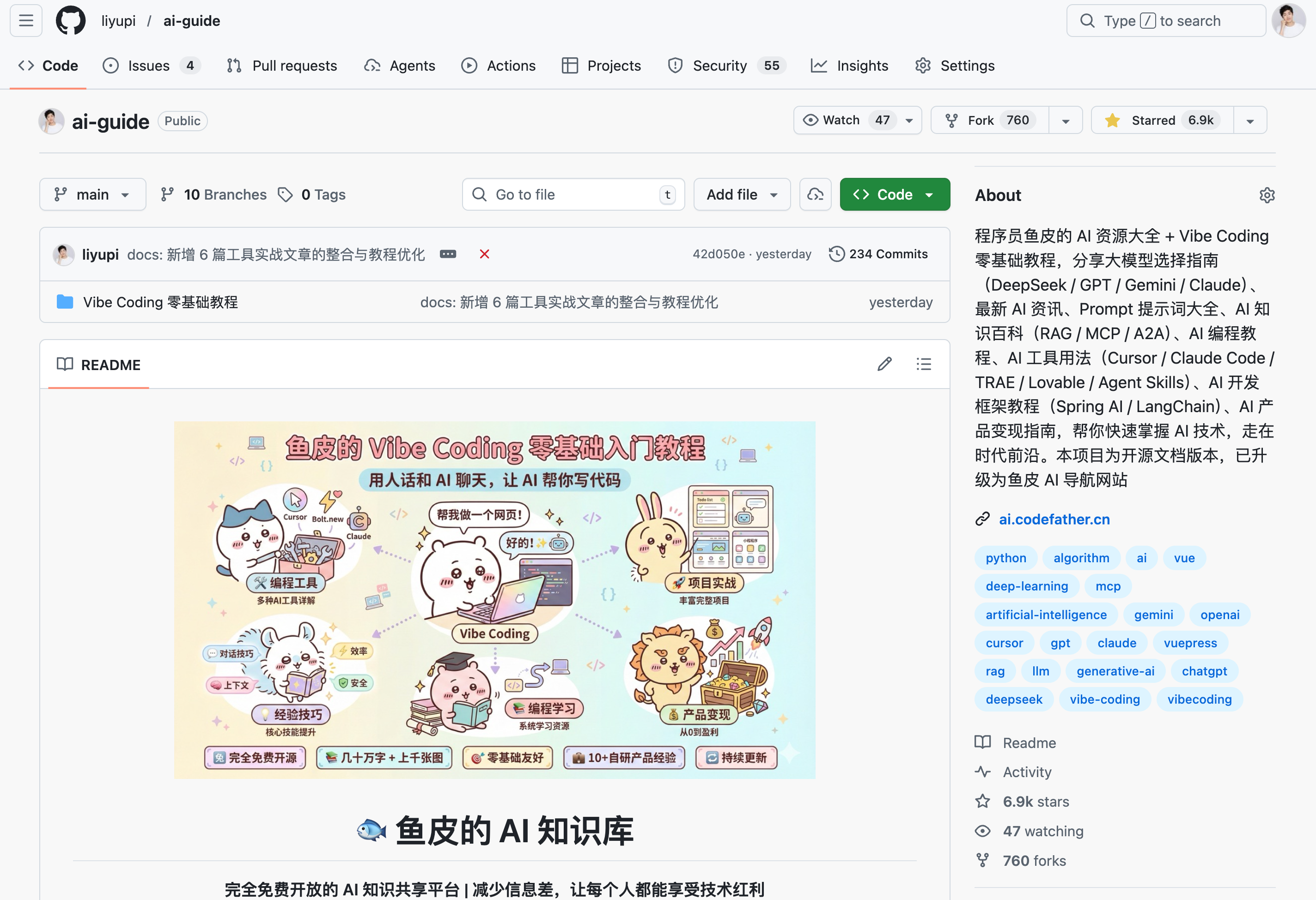 我的编程导航、面试鸭、AI 知识库,每个都是持续迭代出来的,不是写完就扔。我去年重点发力 AI 编程方向,熬夜肝了无数个大爷,打磨 ai-guide 这个免费 AI 教程仓库,从 0 做到了近 7k Star,靠的是持续输出有价值的内容。