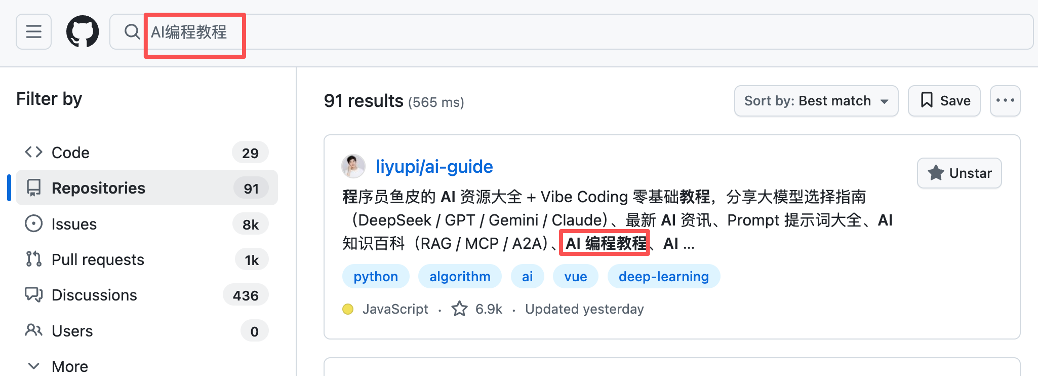 比如我的 ai-guide 项目,在 GitHub 上搜索 "ai guide"、"AI编程教程" 的排名都很靠前,这些自然搜索流量是免费的。你可以搜一下自己项目的核心关键词,看看排第几,然后针对性优化。