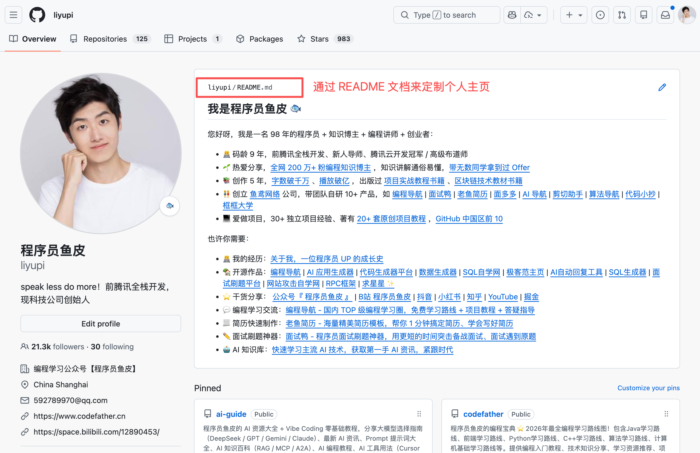 2)装修你的 GitHub 主页:在你的 GitHub 账号下新建一个和用户名同名的仓库,里面的 README 文档会直接展示在你的主页上。