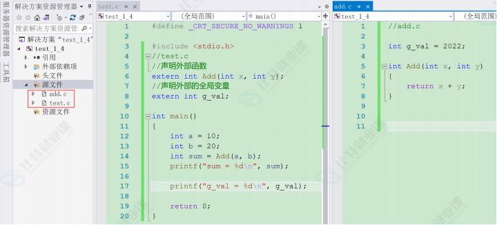 我们在 test.c 的文件中使用了 add.c 文件中的 Add 函数和 g_val 变量。