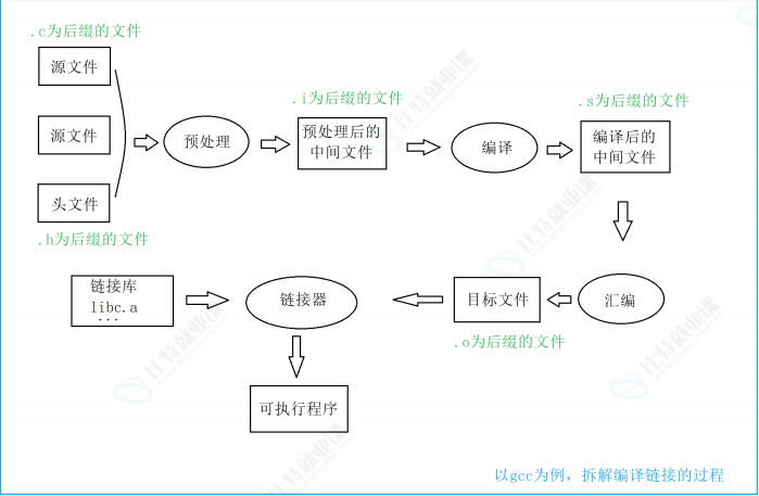 其实翻译环境是由编译和链接两个大的过程组成的,而编译又可以分解成:预处理(有些书也叫预编译)、编译、汇编三个过程。