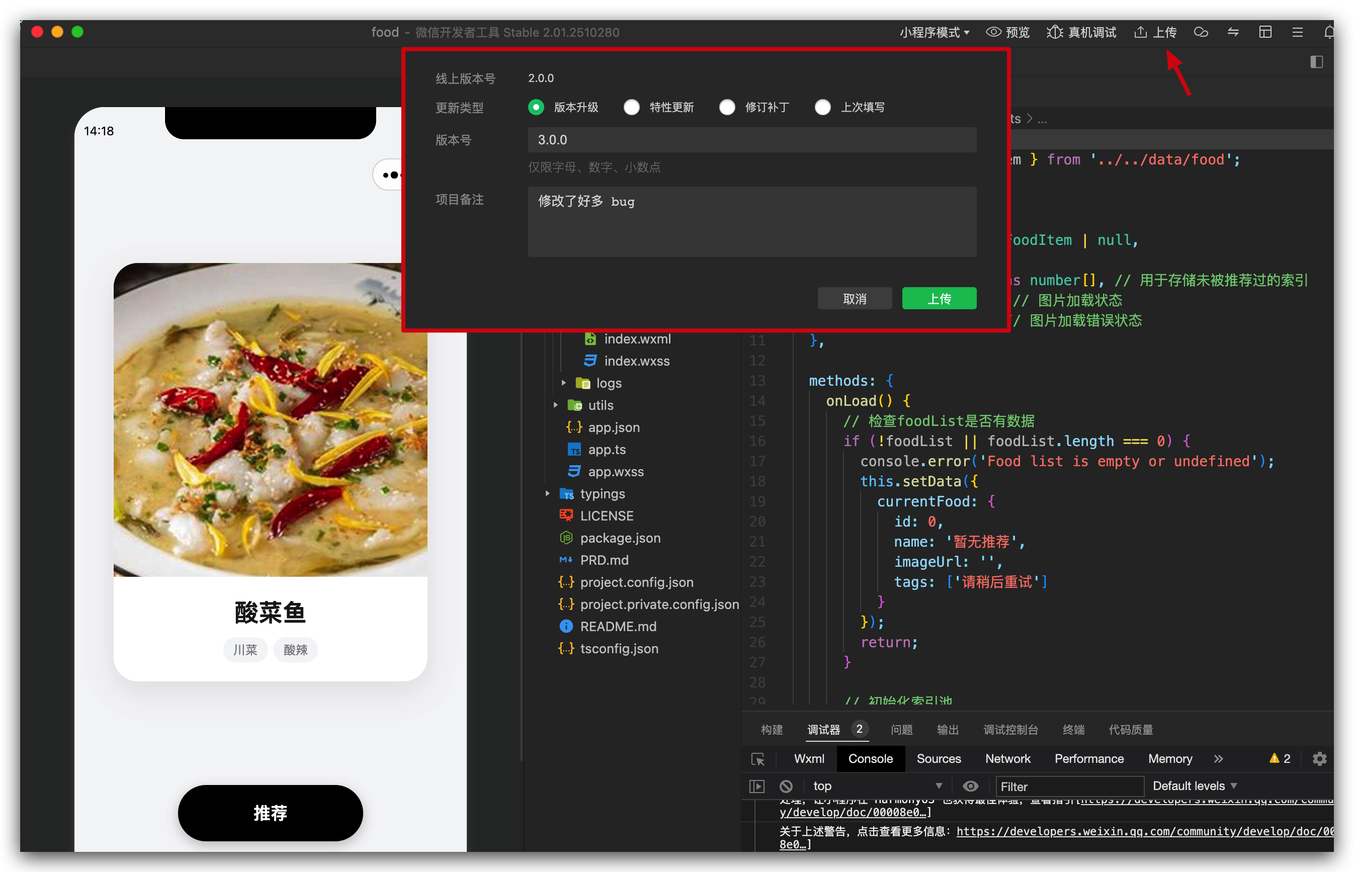 4.代码上传:bug 改到满意后,即可上传到微信审核了。温馨提示下,代码效果预览还是要在微信开发者工具里看的,bug 是在 Trae 上调的。