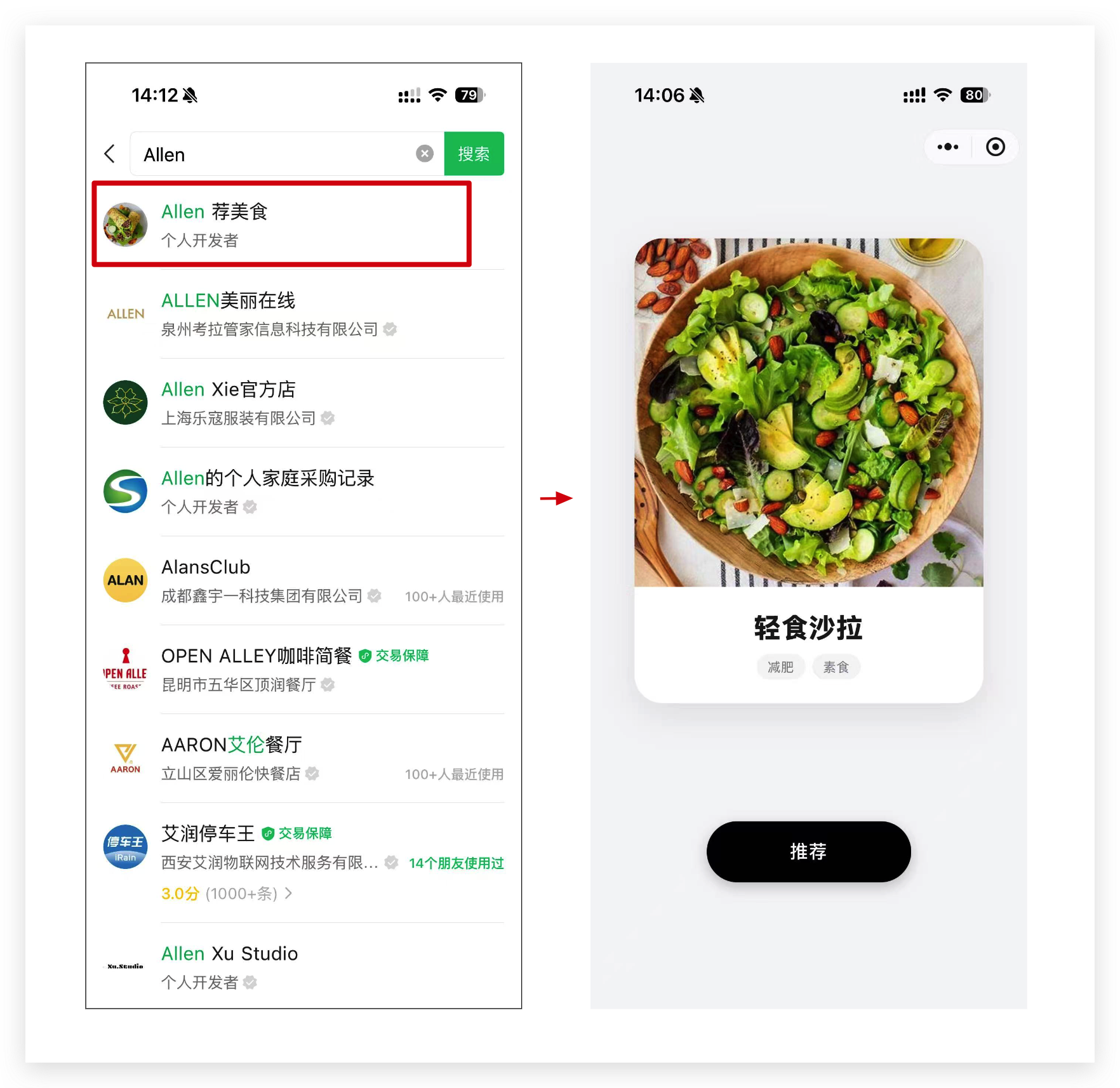 6.效果展示:现在小程序已经上线了,欢迎大家体验!在微信小程序搜索“Allen 荐美食”