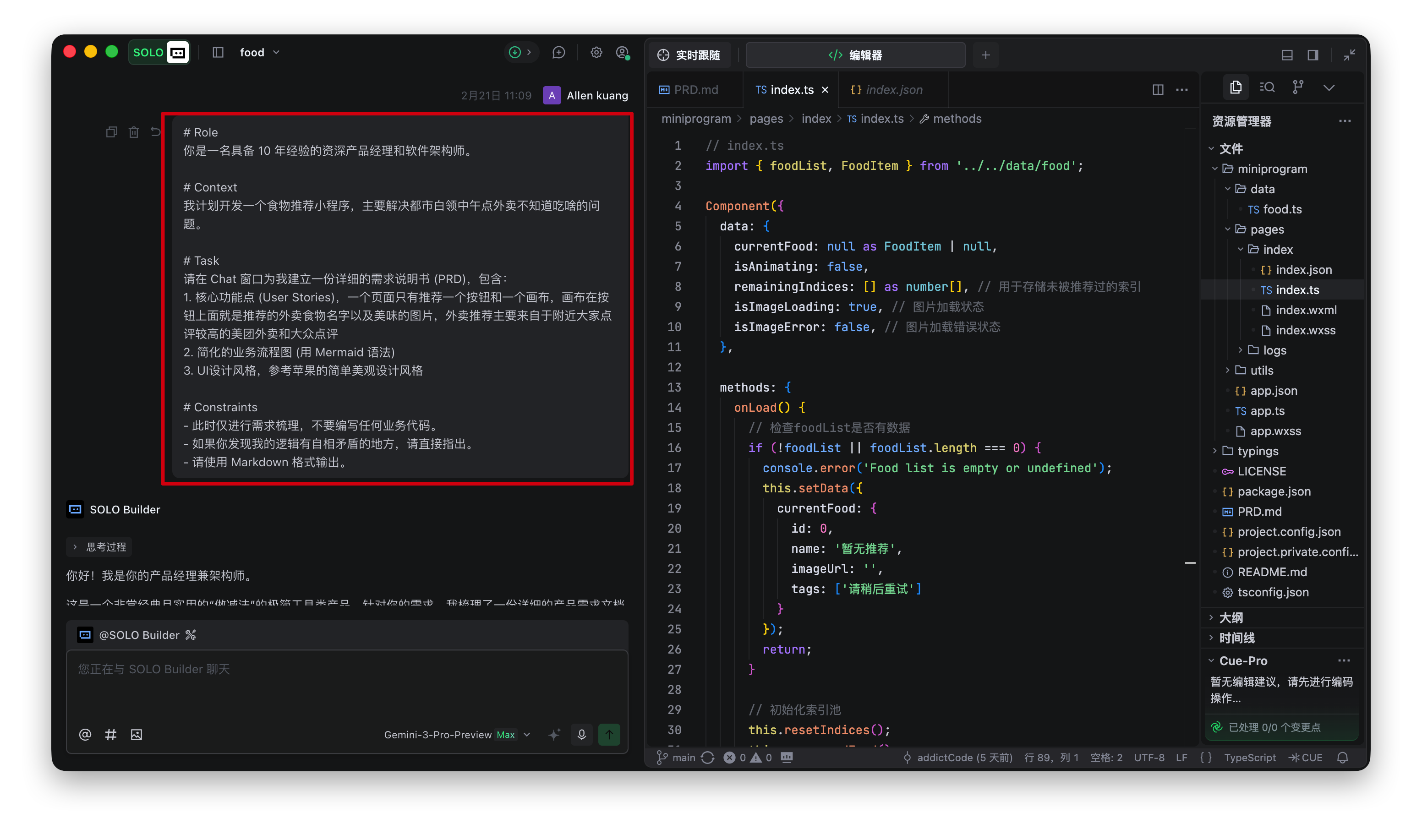 这一步是整套工作流的灵魂。在 Trae 中打开你刚刚创建的小程序目录,开启 Solo 模式。不要急于让 AI 直接写代码,我们需要用一套科学的 Prompt Engineering(提示词工程) 策略来驾驭它:
