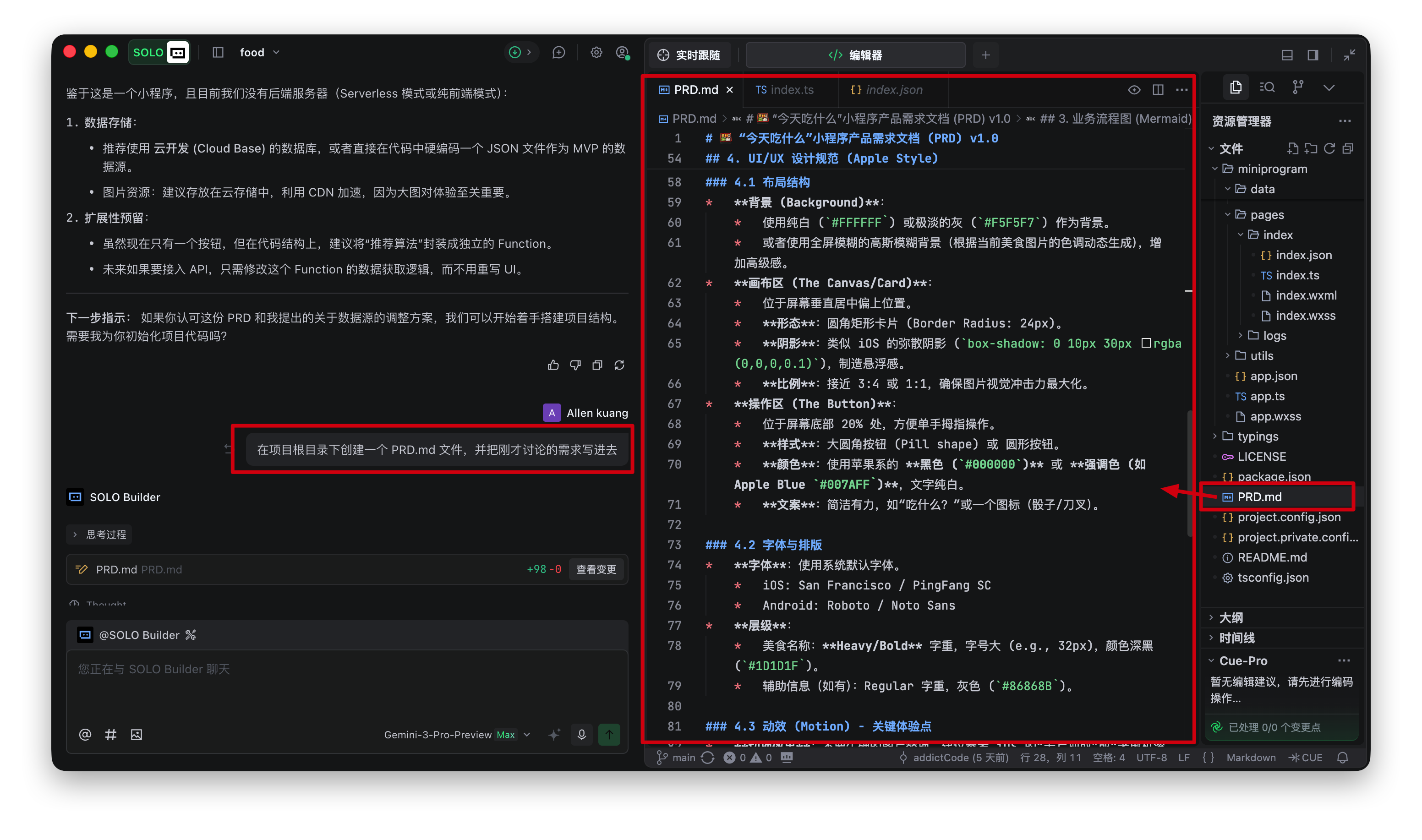 2. 需求验证:输出 PRD.md 验证对齐 需求润色满意后,下发第二道指令:“请根据上述需求,在项目根目录生成一份详细的 PRD.md(产品需求文档),如果哪些细节不对的你可以直接在 PRD 上改”。