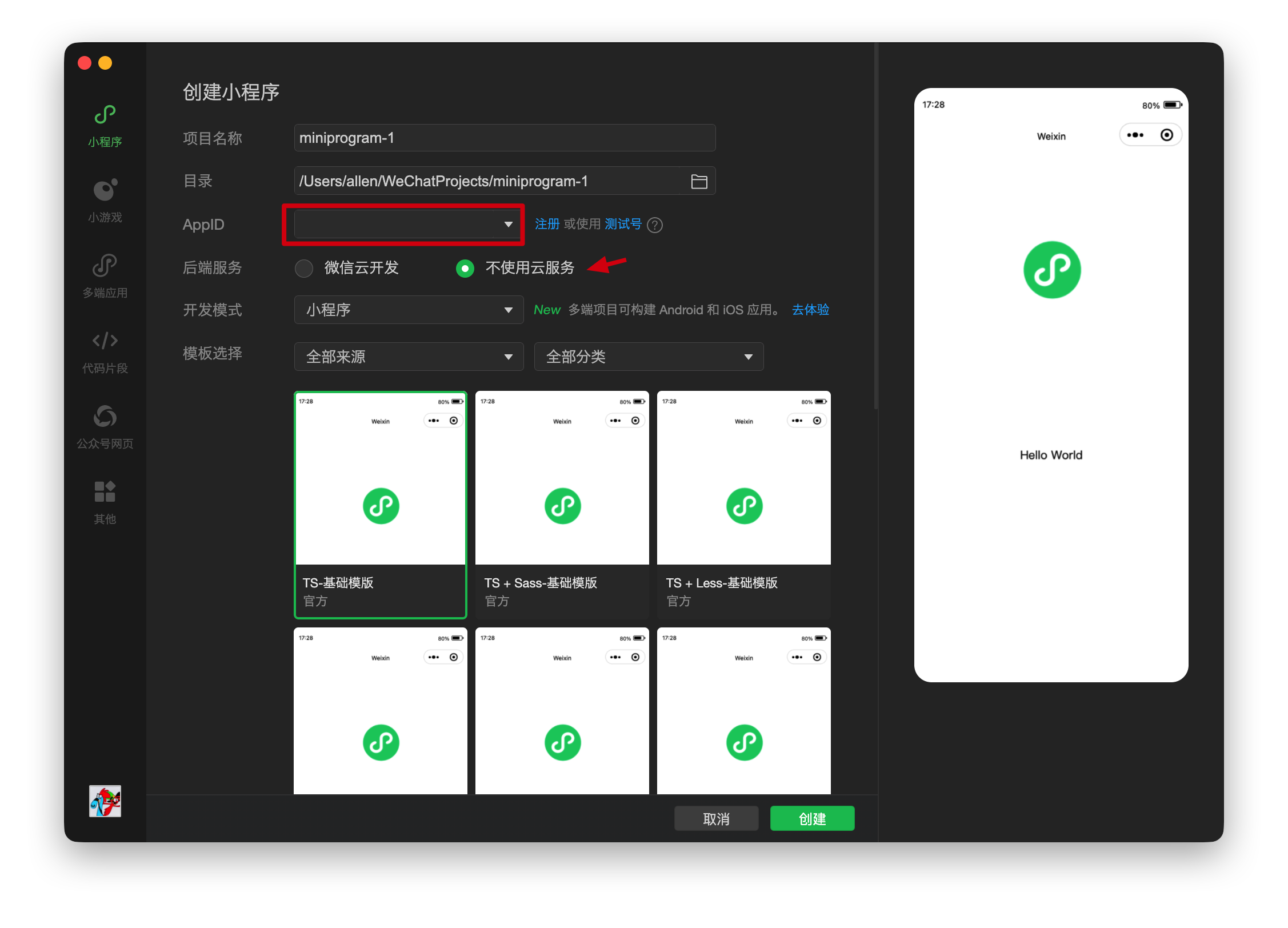 填入刚刚获取的 AppID,选择不使用云开发(按需选择),模板选择“基础模板”。