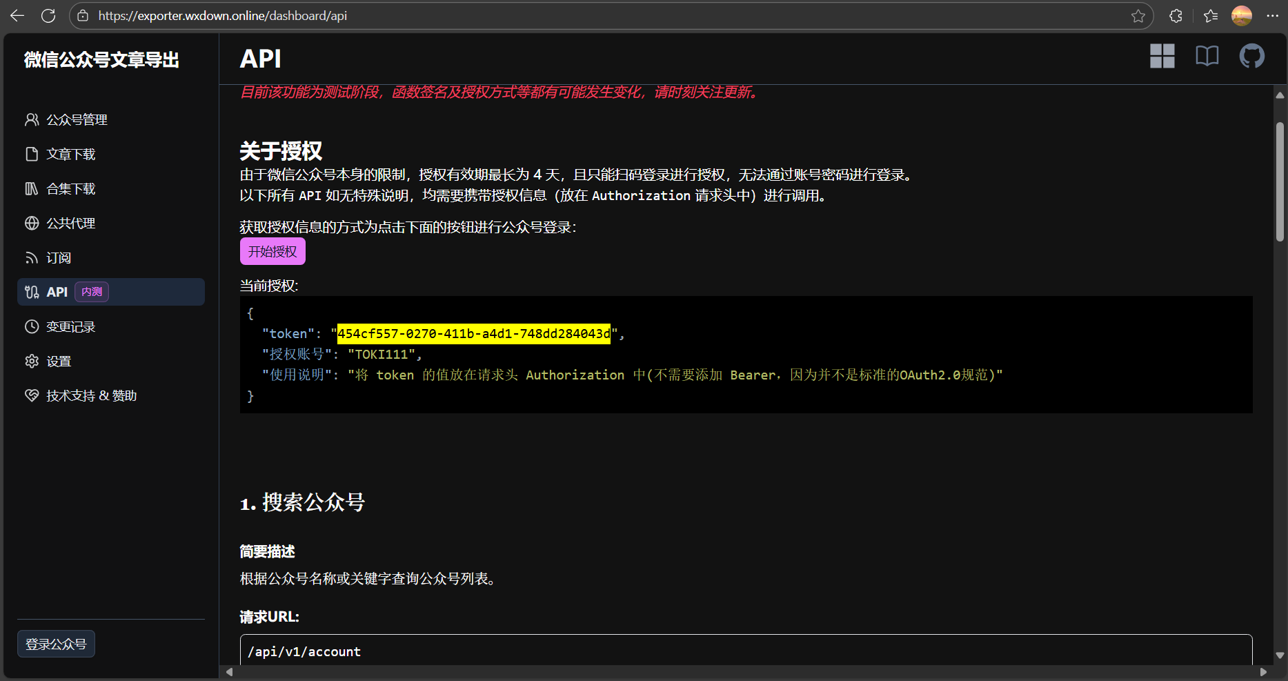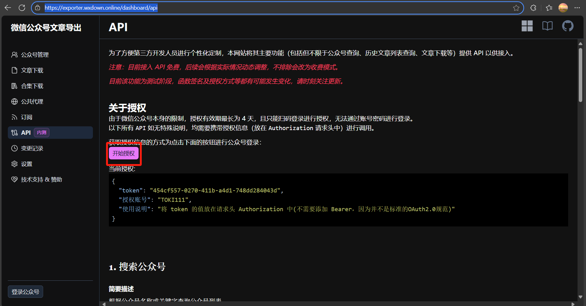 - 注册完毕后前往以下地址点击“开始授权”扫码登录:https://exporter.wxdown.online/dashboard/api