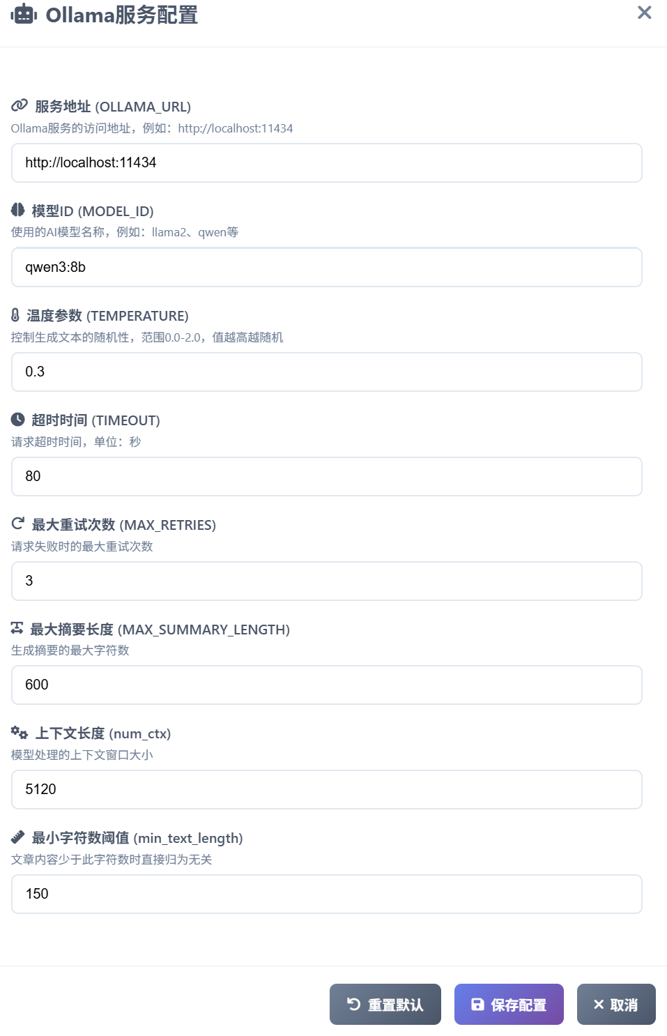 - Ollama配置:用户需要在此处定义本地大模型相关配置参数,其中还包括输入模型的“最大摘要长度”(截取文章前多少字输入模型),以及文章“最小字符数阈值”(少于多少字符就过滤)。“最大摘要字符数”建议保持默认,过长的文章摘要可能导致模型对分类提示词不敏感。