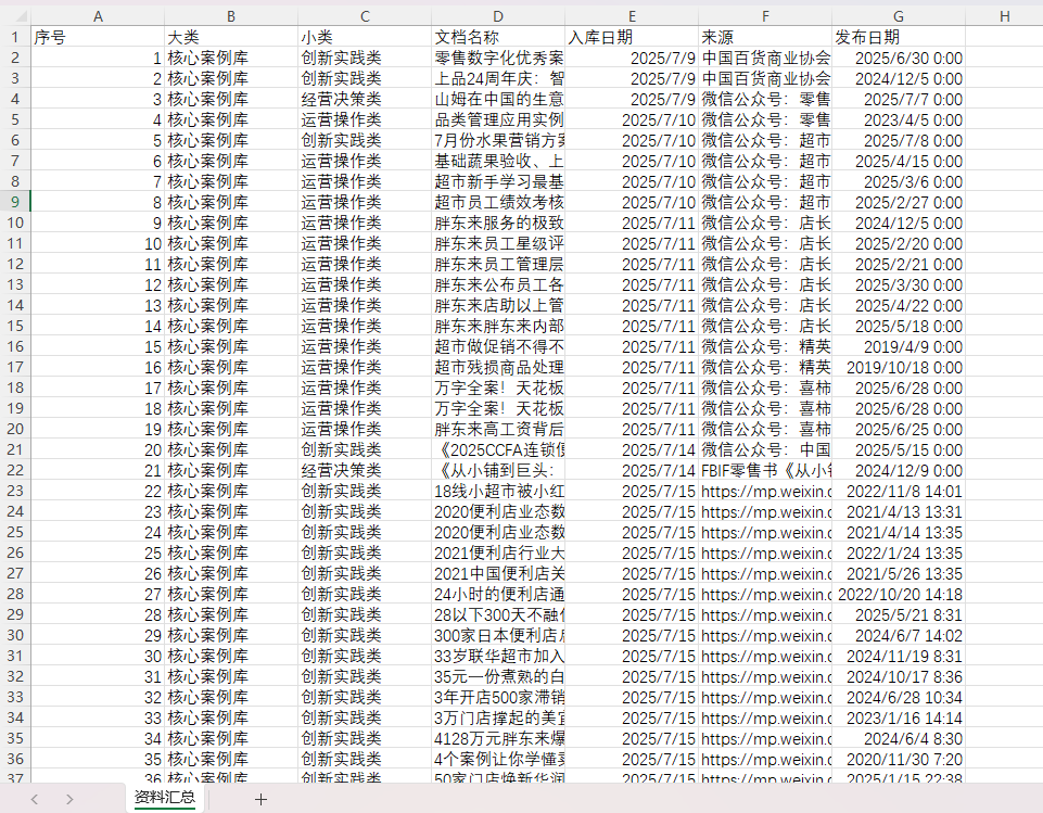 - 系统每下载一篇文章会自动转化成Markdown格式保存到“下载文件夹”并执行一次分类,若触发了“分类标准”,则复制到对应的分类文件夹。若触发“无关”则删除原文档。系统会分批次执行下载和分类,每批文章数量由wechat-article-exporter项目的api返回的结果决定(20-40篇不等)。每批次执行完成后,系统会将该批次的文章信息保存在该路径下创建的“资料汇总.csv”文档中,内容如下图所示: