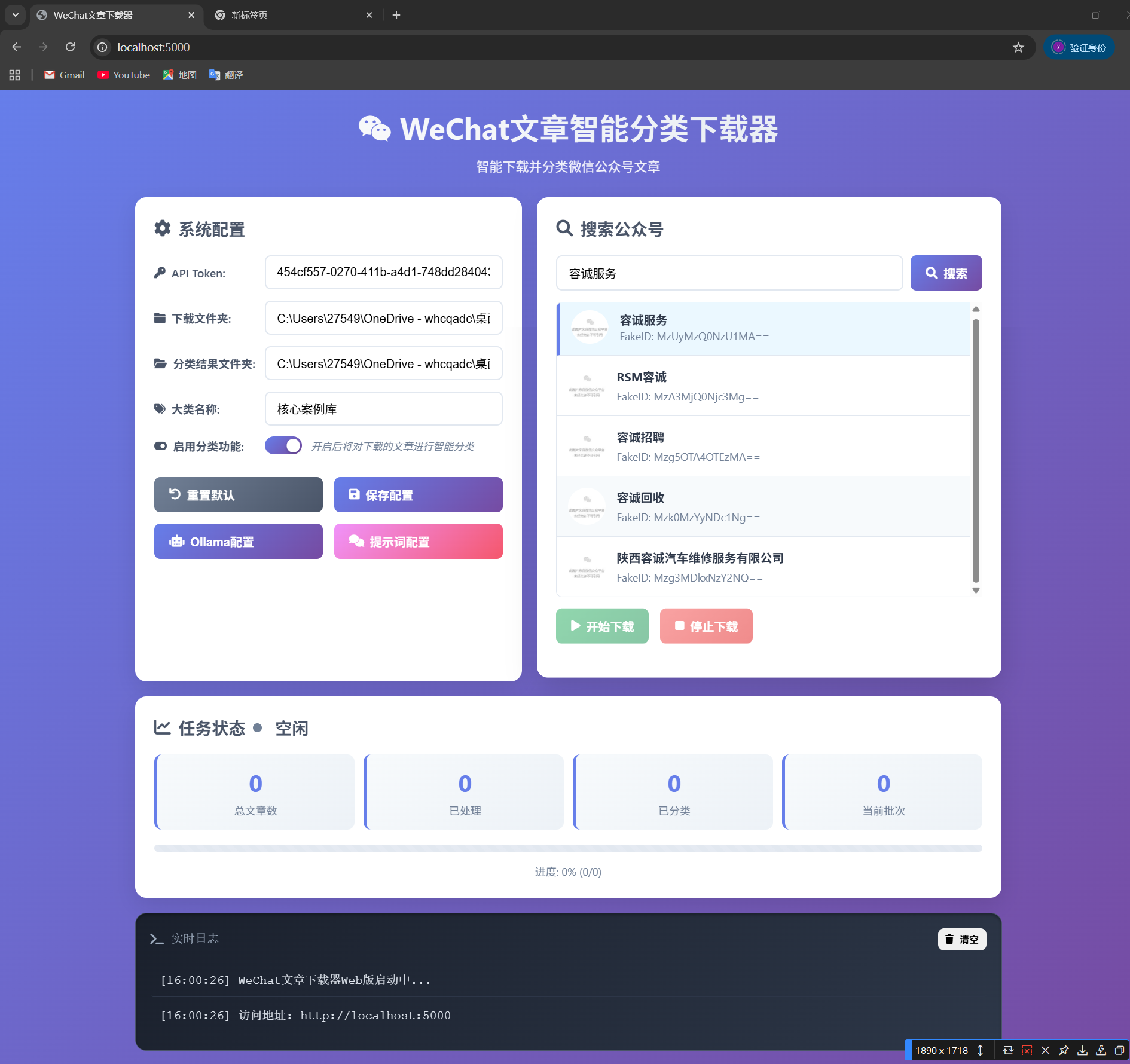 用户可以在页面配置公众号授权API、分类下载路径、Ollama服务、分类规则等,系统会调用Ollama服务配置的本地大模型,对选择的公众号的历史文章按照分类规则执行下载和分类任务,同时记录文章的标题、url链接等信息。