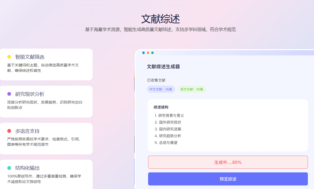 在导入标题和核心文献后,AI可以在几分钟内生成一篇结构完整、逻辑清晰的文献综述初稿。这份初稿的价值,远不止是几千个字: