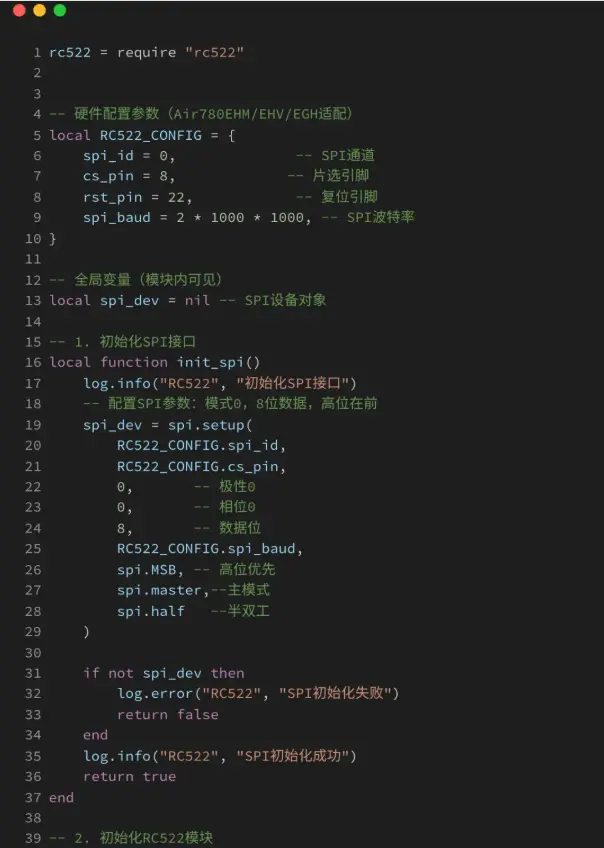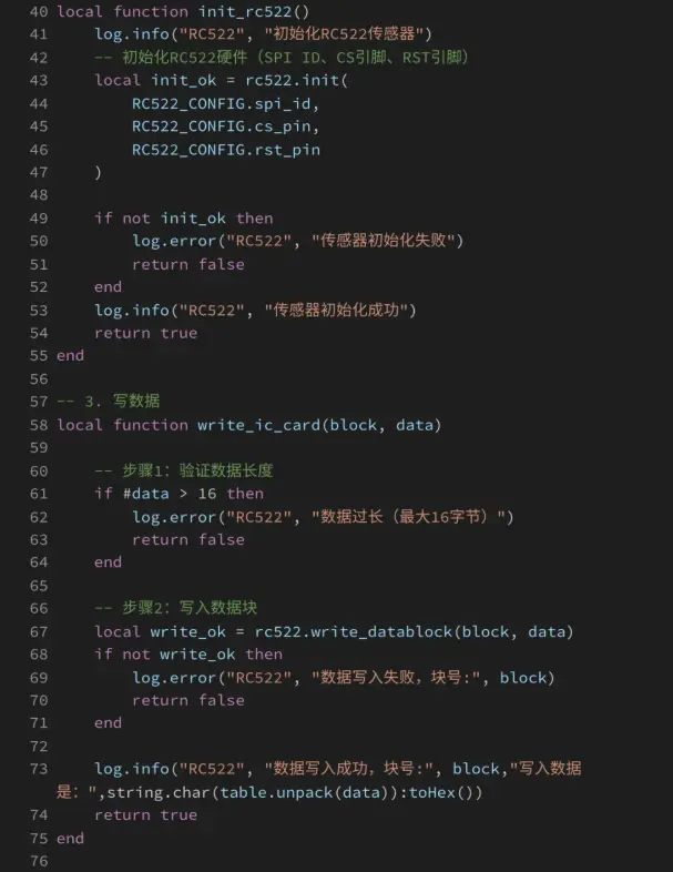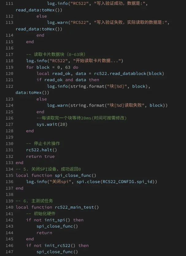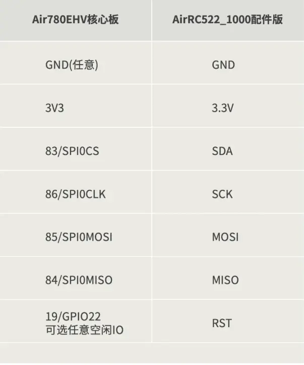 示例基于Air780EHV核心板与LuatOS开发环境,通过SPI接口驱动AirRC522_1000模块,实现对13.56MHz IC卡(如MIFARE卡)的数据读取与写入功能。