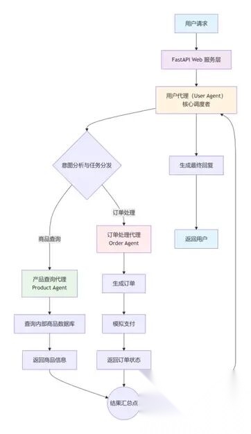 - 订单处理智能体:作为“订单专员”,处理用户购买请求,生成唯一订单号、扣减库存、模拟支付流程,同步记录订单状态。