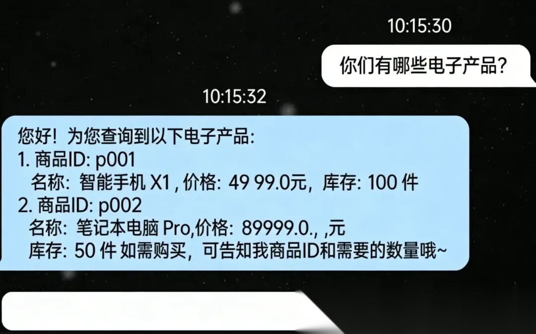 - 鲁棒性增强:当LLM输出不符合工具调用格式时,补充兜底逻辑,比如提示用户“请明确告知商品ID和购买数量”,避免系统直接报错。