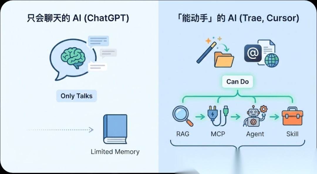 用 Trae 输入一句话就能生成整个项目,Cursor 能 @ 文件、@ 网页——这些「能动手」的 AI 和只会聊天的 ChatGPT 有啥不同?背后是一套从 RAG、MCP 到 Agent、Skill 的底层逻辑。今天用对话帮你讲清楚。