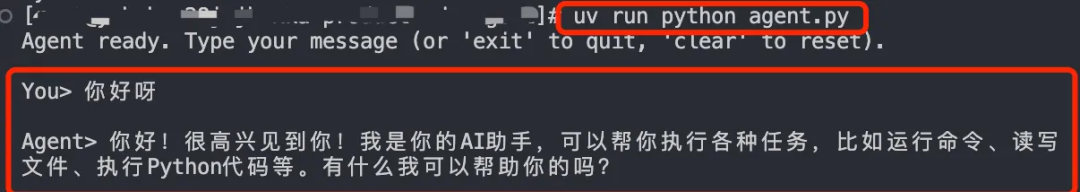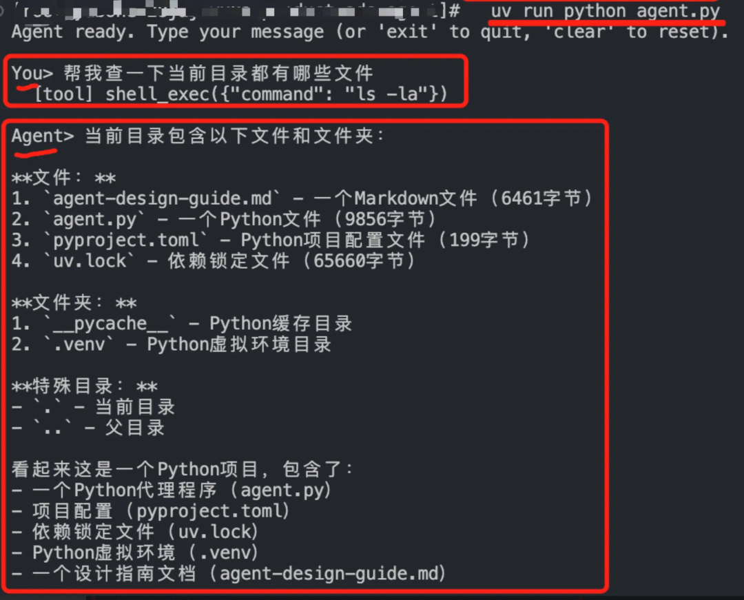避免增加读者认知负担,从极简思想出发,这里使用Python CLI REPL 即Python的交互式命令行作为Agent的入口: