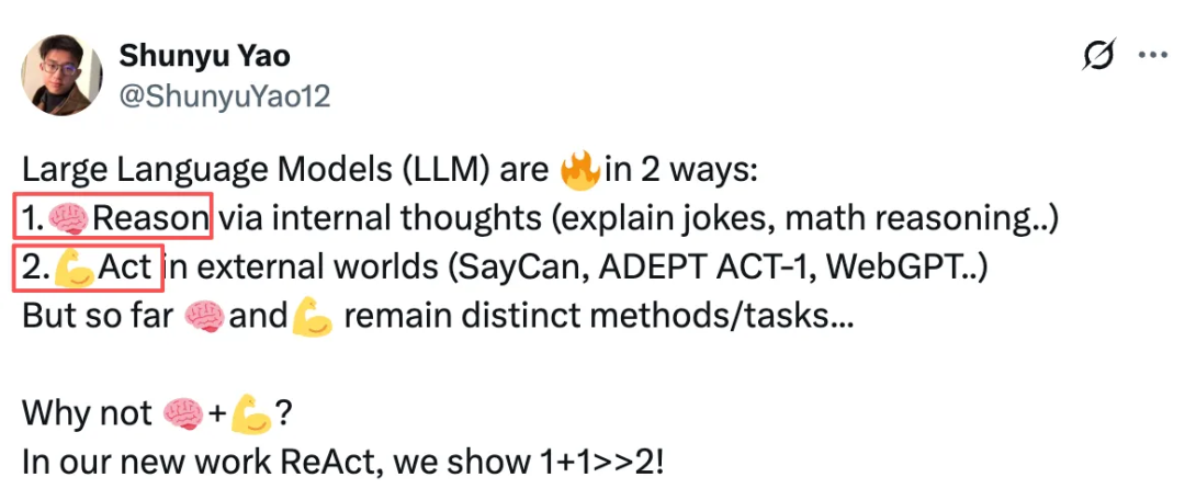 在当前AI Agent理论中,最具有基础性与代表性的要数ReAct模式,它是Yao等人于2022年在《ReAct: Synergizing Reasoning and Acting in Language Models》论文中提出,核心思想将推理(Reasoning)和行动(Acting)相结合。CoT提升的是LLM的推理能力,但它的缺点在于缺少与外部世界的交互从而缺少外部反馈来拓展自身的知识空间,ReAct弥补了这一缺陷。