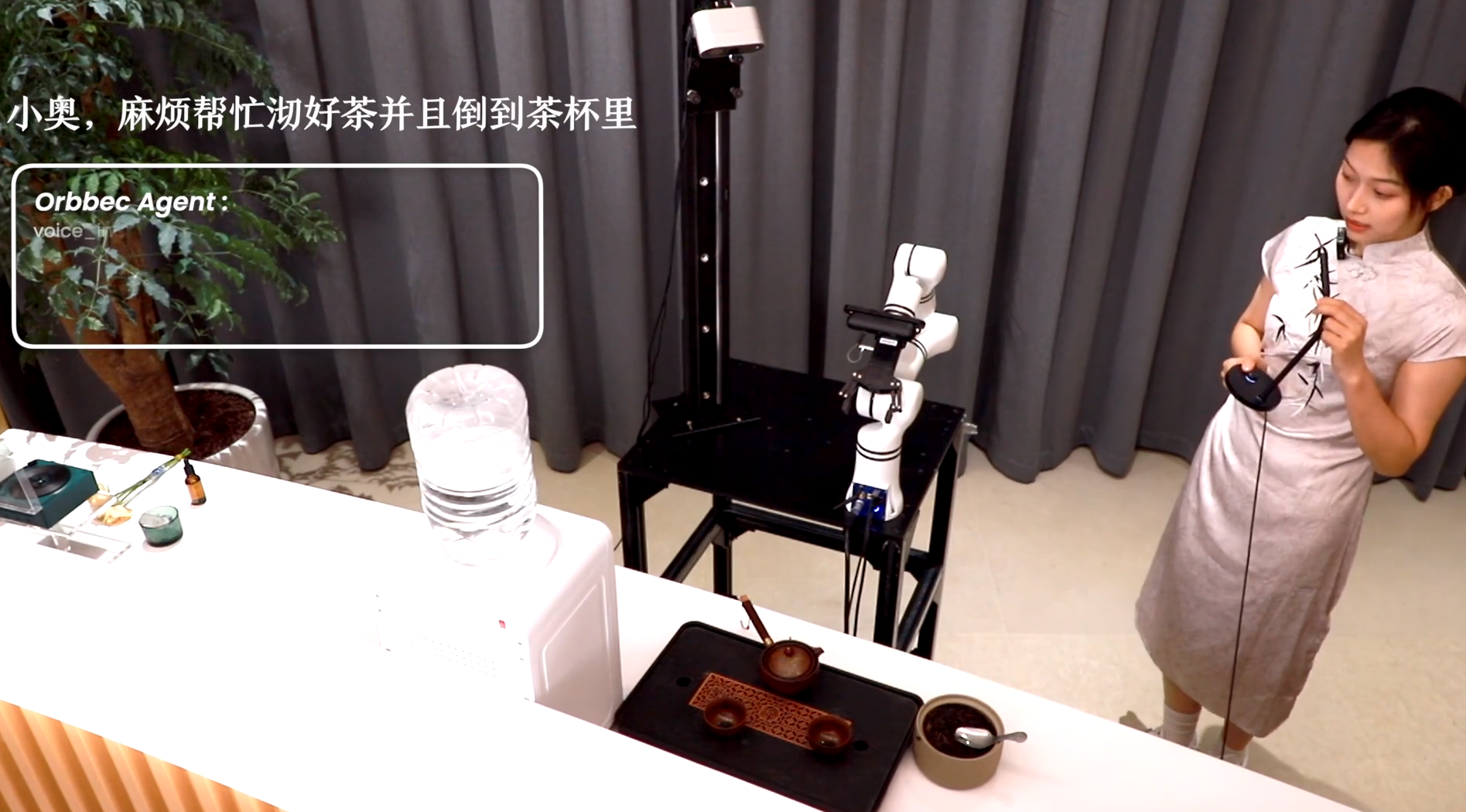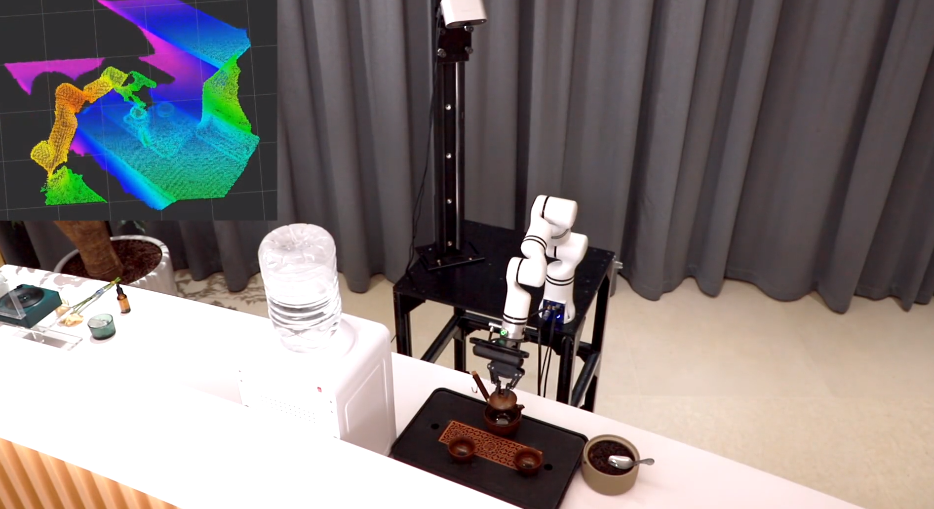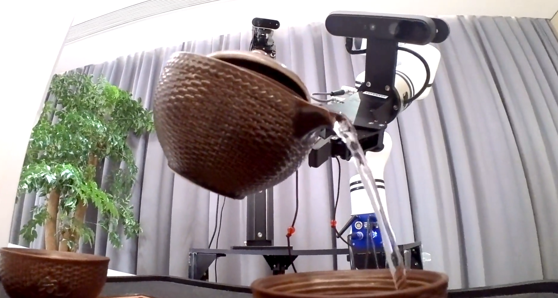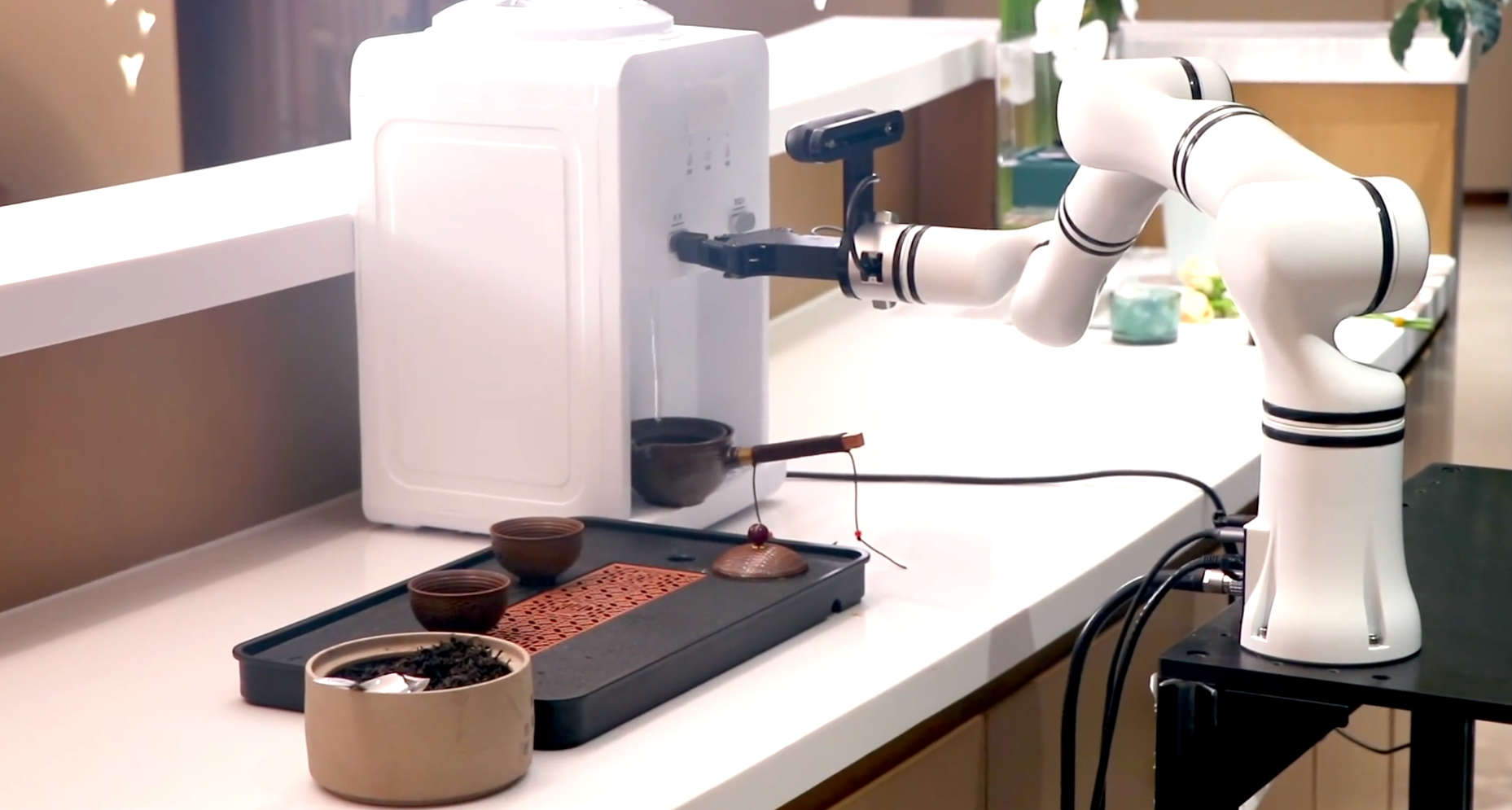 机械臂在深度相机支持下实现茶具定位、动作引导,最终完成置茶、冲泡、倒茶、奉茶全流程。