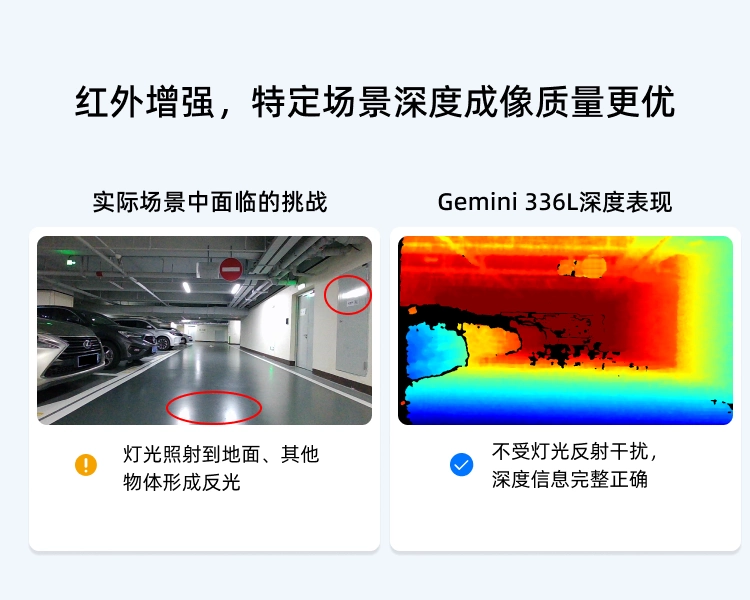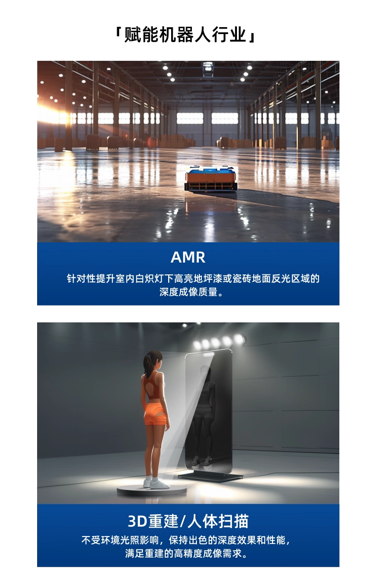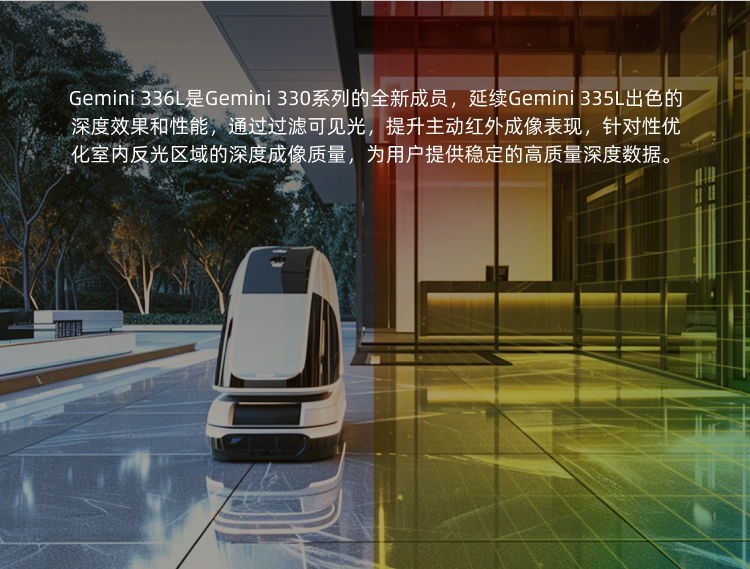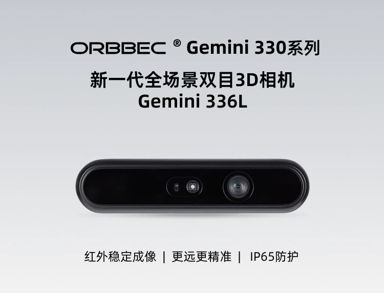 Gemini 336L是奥比中光新一代全场景双目3D相机-Gemini 330系列的旗舰产品,能适应最广泛的场景需求。Gemini 336L搭载奥比中光最新自研的先进深度引擎芯片MX6800,配备高性能主被动融合成像系统,具备出色的环境适应性,能够在户外、室内、夜晚、白昼等不同光照条件以及复杂多变的动态环境中稳定输出高质量深度数据,精准还原场景和物体的3D信息,广泛适用于AMR、巡检机器人、协作机械臂等机器人和AI视觉应用场景。