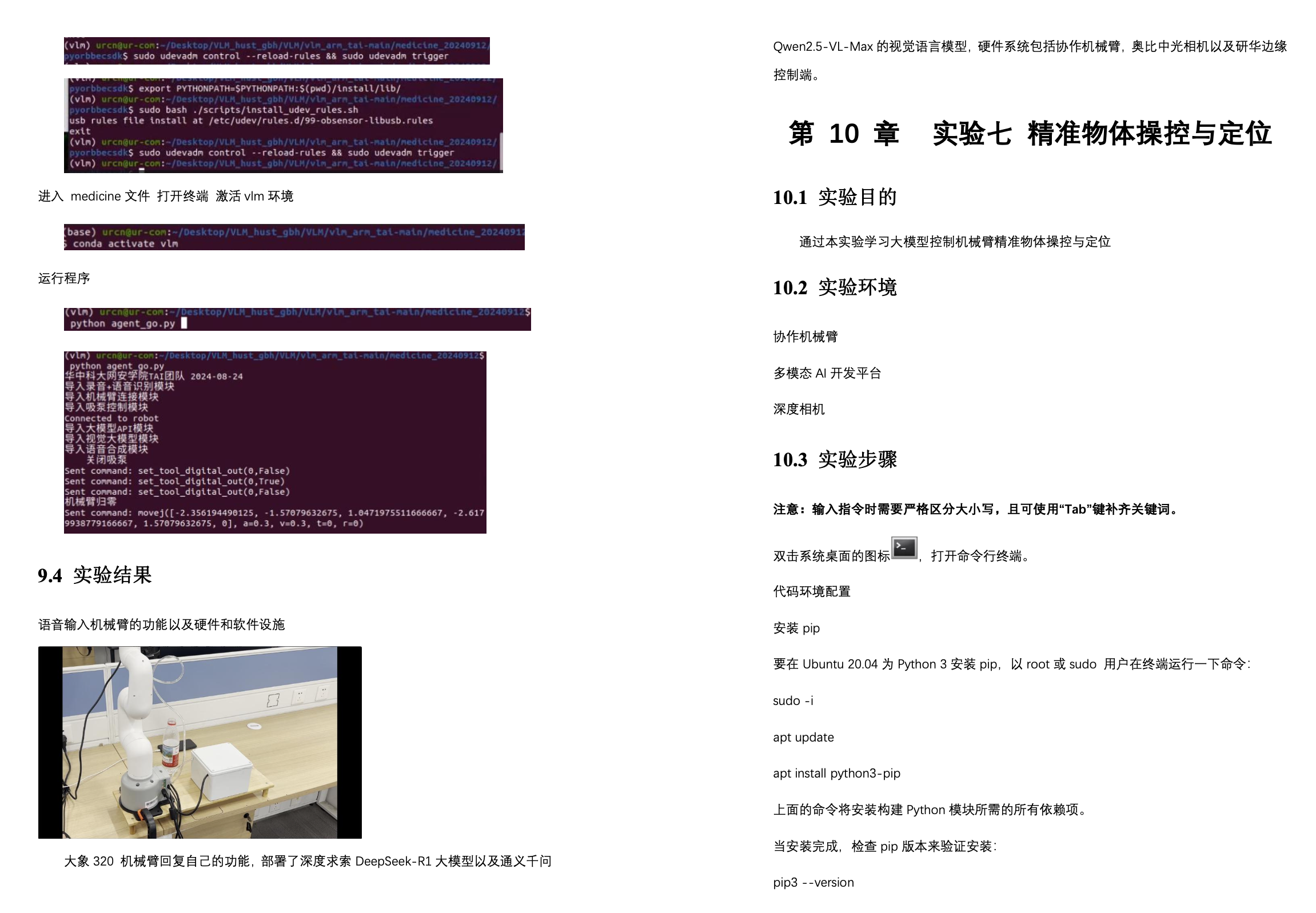2.实验 5:基于推理的优化执行(大模型的分布式推理实操与动作执行优化)使用 ROS 和 C++编程控制机械臂,控制机械臂实现复杂的动态交互,实现复杂轨迹规划与误差补偿,进行系统鲁棒性分析与优化。
