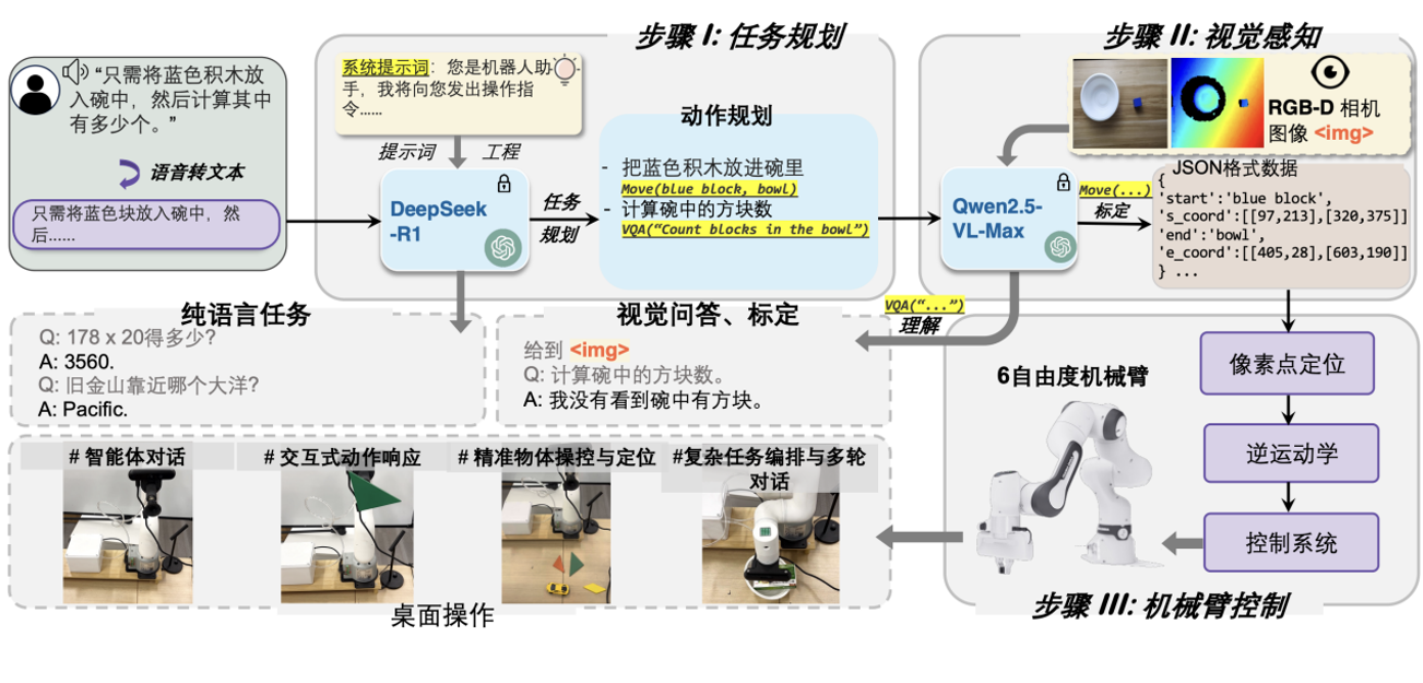 语音指令通过DeepSeek解析为动作指令,并通过视觉感知模块定位目标物体。视觉模块通过3D相机构建环境的三维模型,并实时跟踪物体位置。语音和视觉数据通过多模态大模型进行融合,以实现指令的准确传达和物体的精确定位。