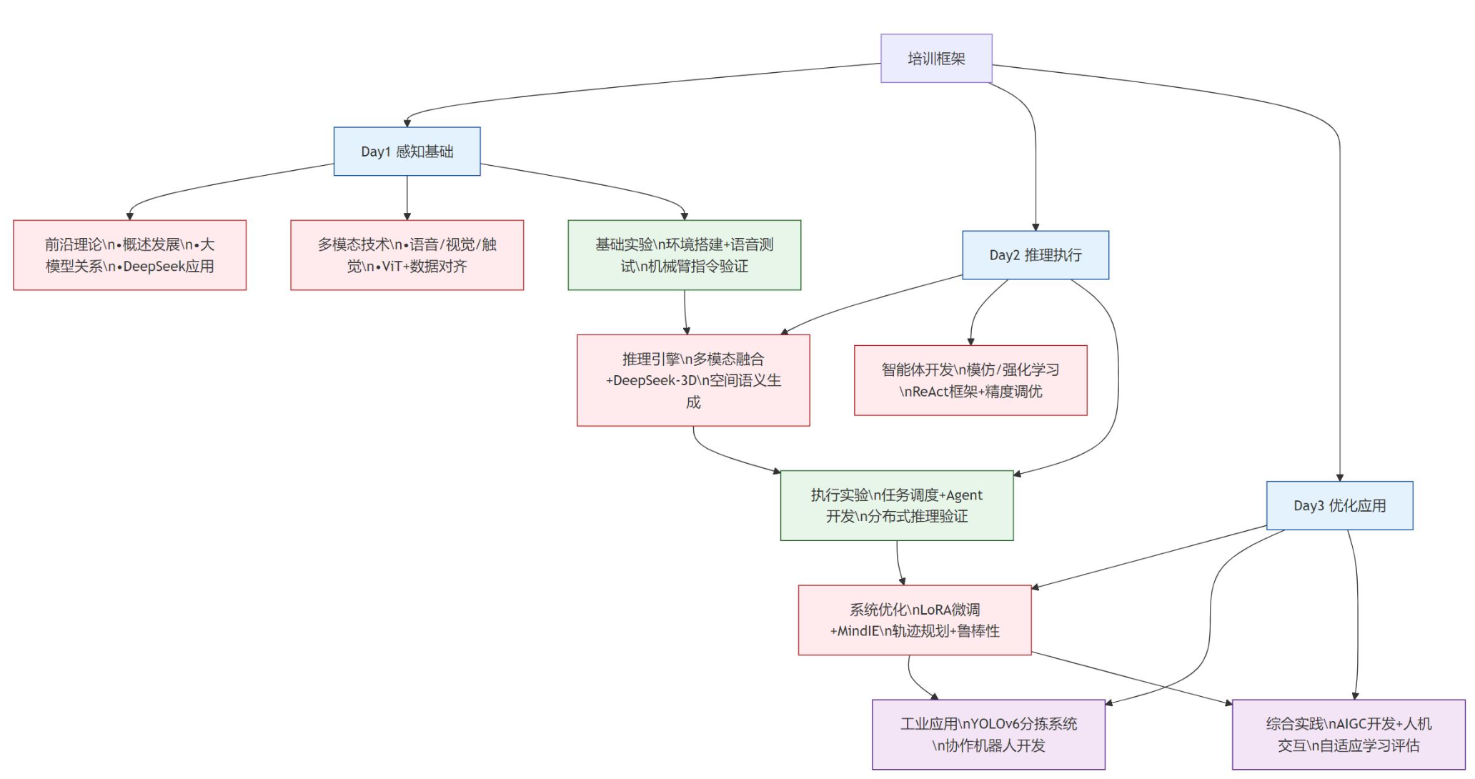 - 具身感知原理。物体感知、行为感知、场景感知实现识别与特征提取,动作意图的理解;学习DeepSeek模型的部署和优化方法,包括语言模型 LLM,BERT, GPT 系列模型比较,Transformer 架构;大模型开发基础:大模型的训练与应用、大模型实操与 API 调用、提示工程技术;RAG基础与架构:RAG 基础与架构、文档切分常见算法、向量数据库常见算法。